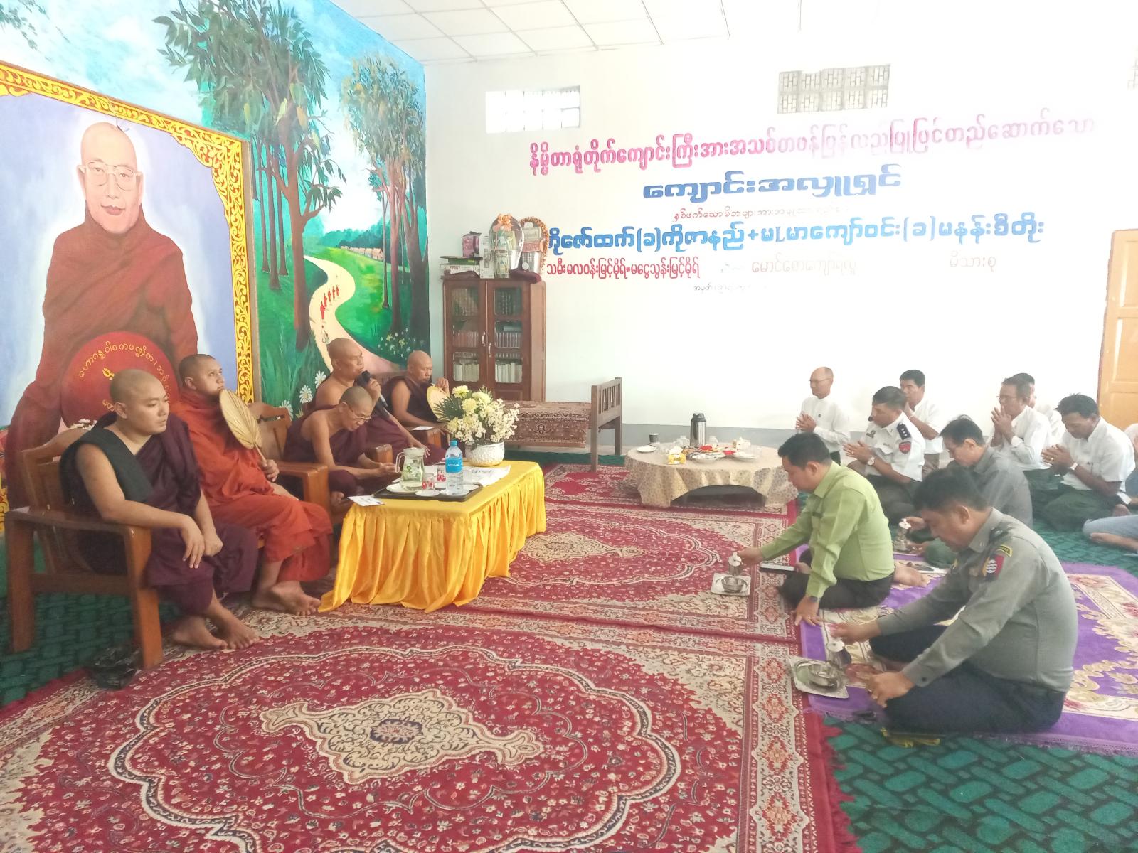 အဆိုပါအခမ်းအနားကို နမောတဿ သုံးကြိမ်ရွတ်ဆိုဘုရားကန်တော့၍ အခမ်းအနားဖွင့်လှစ်ခဲ့ပြီး မြို့နယ်စီမံခန့်ခွဲရေးနှင့်အုပ်ချုပ်ရေးကော်မတီဥက္ကဋ္ဌ ဦးခင်မောင်ဦးနှင့် အဖွဲ့ဝင်များ၊ ဌာနဆိုင်ရာ အကြီးအကဲများနှင့် တာဝန်ရှိသူများ တက်ရောက်ခဲ့ကြပြီး မြို့နယ်သံဃာ့နာယက အကျိုးတော်ဆောင် ဆရာတော်ဘဒ္ဒန္တတိဏ္ဏကထံမှ ငါးပါးသီလဆောက်တည်ခံယူကာ ဆရာတော်ကြီးထံမှ အနုမောဒနာတရားတော်များ နာယူခဲ့ကြပြီးနောက် ရေစက်ချအမျှပေးဝေခဲ့ပြီး ဆရာတော်ကြီးများနှင့် စာဖြေသံဃာတော်များအား မြို့နယ်စီမံခန့်ခွဲရေးနှင့်အုပ်ချုပ်ရေးကော်မတီဥက္ကဋ္ဌ နှင့် အဖွဲ့ဝင်များ၊ တာဝန်ရှိသူများက နေ့ဆွမ်းဆက်ကပ် လှူဒါန်းခဲ့ကြောင်းသိရသည်။