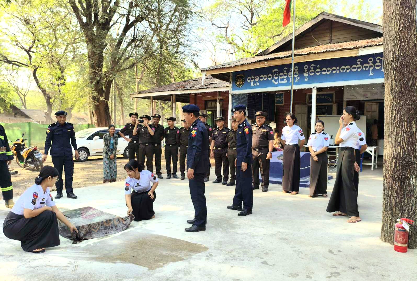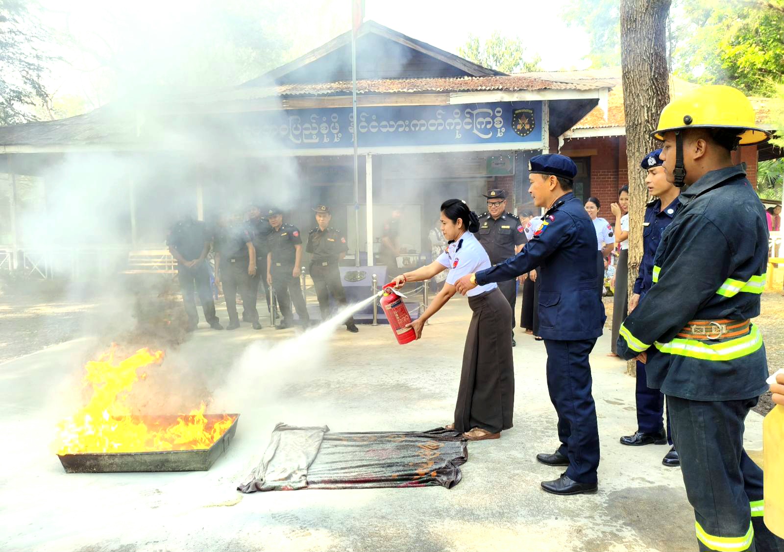 ထို့နောက် မြို့နယ်မီးသတ်ဦးစီးမှူးနှင့် မီးသတ်တပ်ဖွဲ့ဝင်များက လူဝင်မှုကြီးကြပ်ရေးနှင့်ပြည်သူ့အင်အားဝန်ကြီးဌာန မြို့နယ်ဦးစီးမှူးရုံးမှ ဝန်ထမ်းများအား မီးဘေးအန္တရာယ် ကြုံတွေ့လာပါက စနစ်တကျ မီးငြှိမ်းသတ်နိုင်ရန် မီးငြှိမ်းသတ်ပစ္စည်းများ အသုံးပြု၍ မီးငြှိမ်းသတ်ခြင်း၊ ရေစိုဝတ်ဖြင့် မီးငြှိမ်းသတ်ခြင်းနှင့် မီးသတ်ဆေးဘူးဖြင့် မီးငြှိမ်းသတ်နည်းစနစ်များကို ဇာတ်တိုက်လေ့ကျင့် သရုပ်ပြသရာ ဝန်ထမ်းများအဖွဲ့က ပူးပေါင်းပါဝင်လေ့ကျင့်ဆောင်ရွက်ခဲ့ကြကြောင်း သိရသည်။