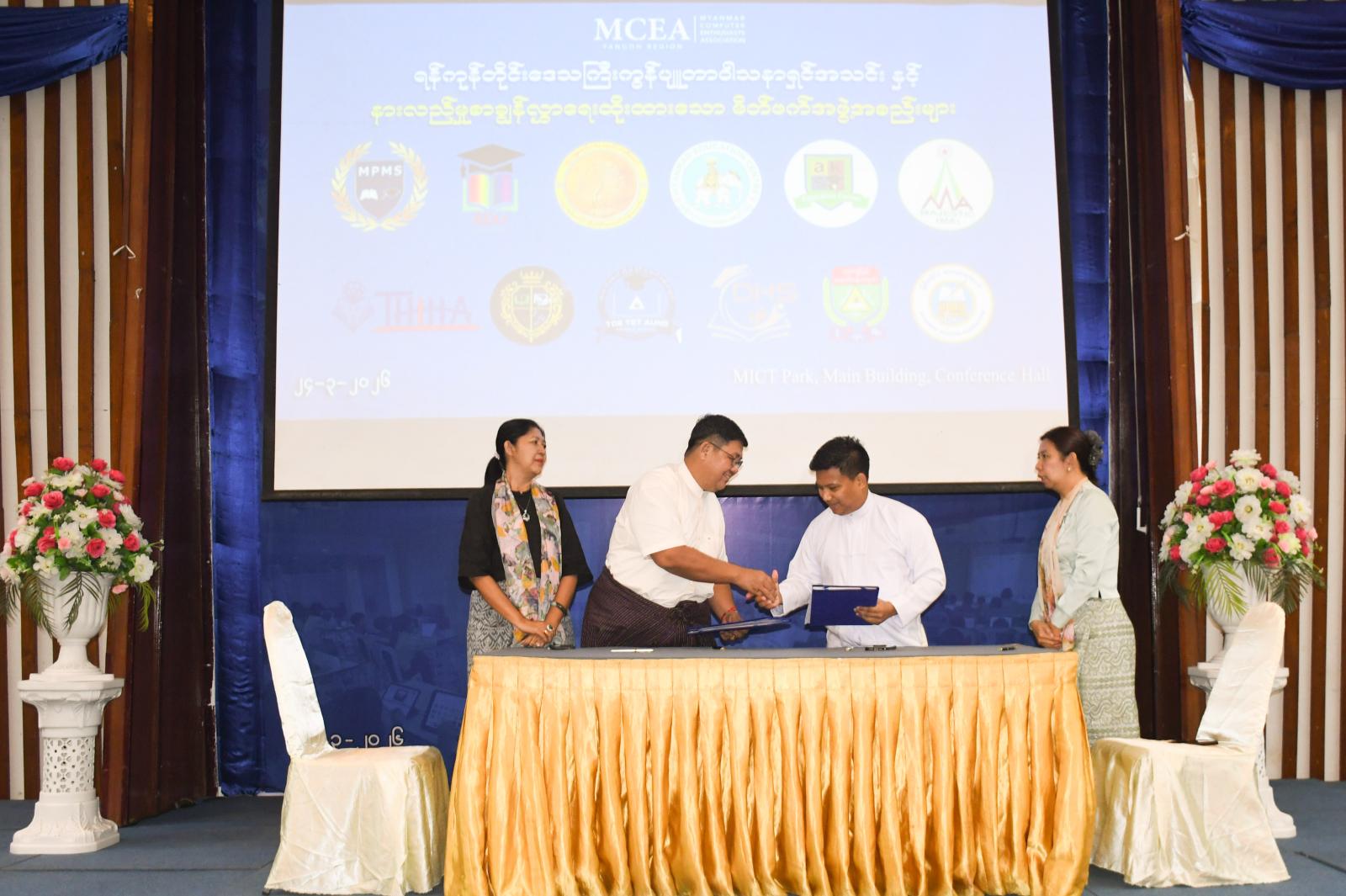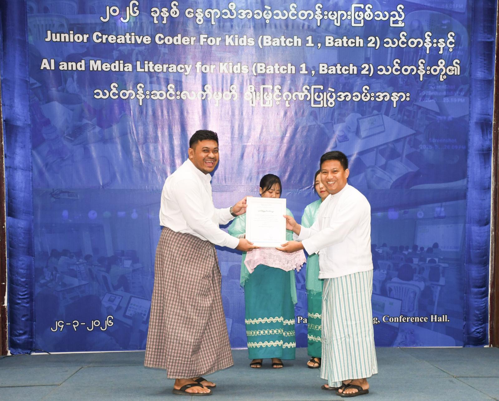ရန်ကုန်တိုင်းဒေသကြီး၊ ကွန်ပျူတာဝါသနာရှင်အသင်း၏ မိတ်ဖက်အဖွဲ့အစည်းများနှင့် နားလည်မှုစာချွန်လွှာ (MOU) ရေးထိုးခြင်းနှင့် ရန်ကုန်တိုင်းဒေသကြီး ကွန်ပျူတာဝါသနာရှင်အသင်းမှ ကြီးမှူးဖွင့်လှစ်သော ၂ဝ၂၆ ခုနှစ်၊ နွေရာသီအခမဲ့သင်တန်းများဖြစ်သည့် Junoir Creative Coding For Kids (Batch 1, Batch 2) 4 Al And Media Literacy For Kids (Batch 1, Batch 2)တို့၏ သင်တန်းဆင်းပွဲ အခမ်းအနားကို ယမန်နေ့ နံနက်ပိုင်းတွင် MICT Park Main Building, Conference Hall ၌ ကျင်းပသည်။