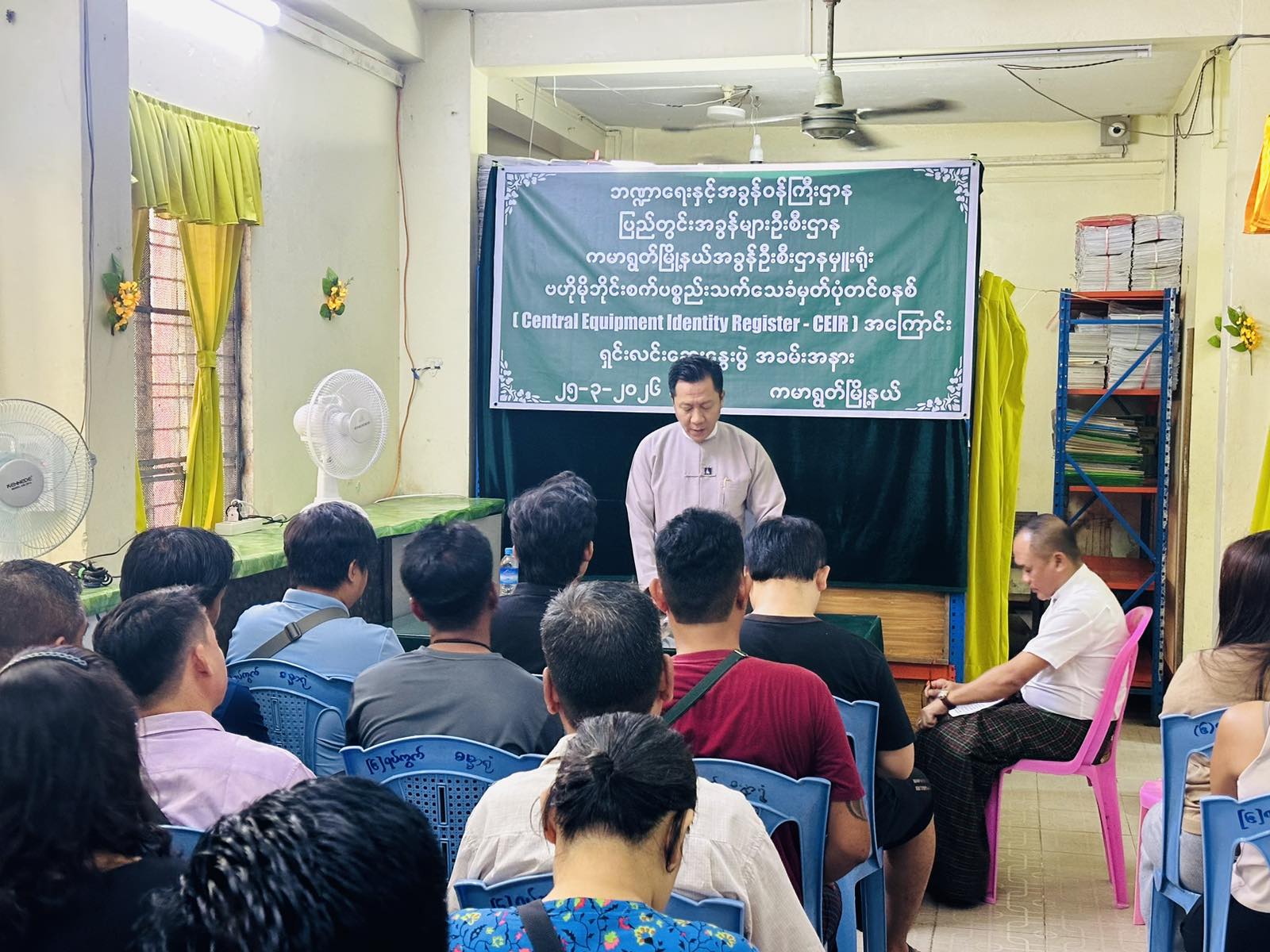 ရန်ကုန်တိုင်းဒေသကြီး ပြည်တွင်းအခွန်များဦးစီးဌာန ကမာရွတ်မြို့နယ် အခွန်ဦးစီးဌာနမှူးရုံးမှ ဗဟိုမိုဘိုင်း စက်ပစ္စည်းသက်သေခံမှတ်ပုံတင်စနစ် (Central Equiment Identity Register-CEIR) အကြောင်း ရှင်းလင်းဆွေးနွေးပွဲကို ယနေ့နံနက် ၁၁ နာရီအချိန်တွင် ကမာရွတ်မြို့နယ် အခွန်ဦးစီးဌာနမှူးရုံးတွင် ကျင်းပခဲ့ပါသည်။