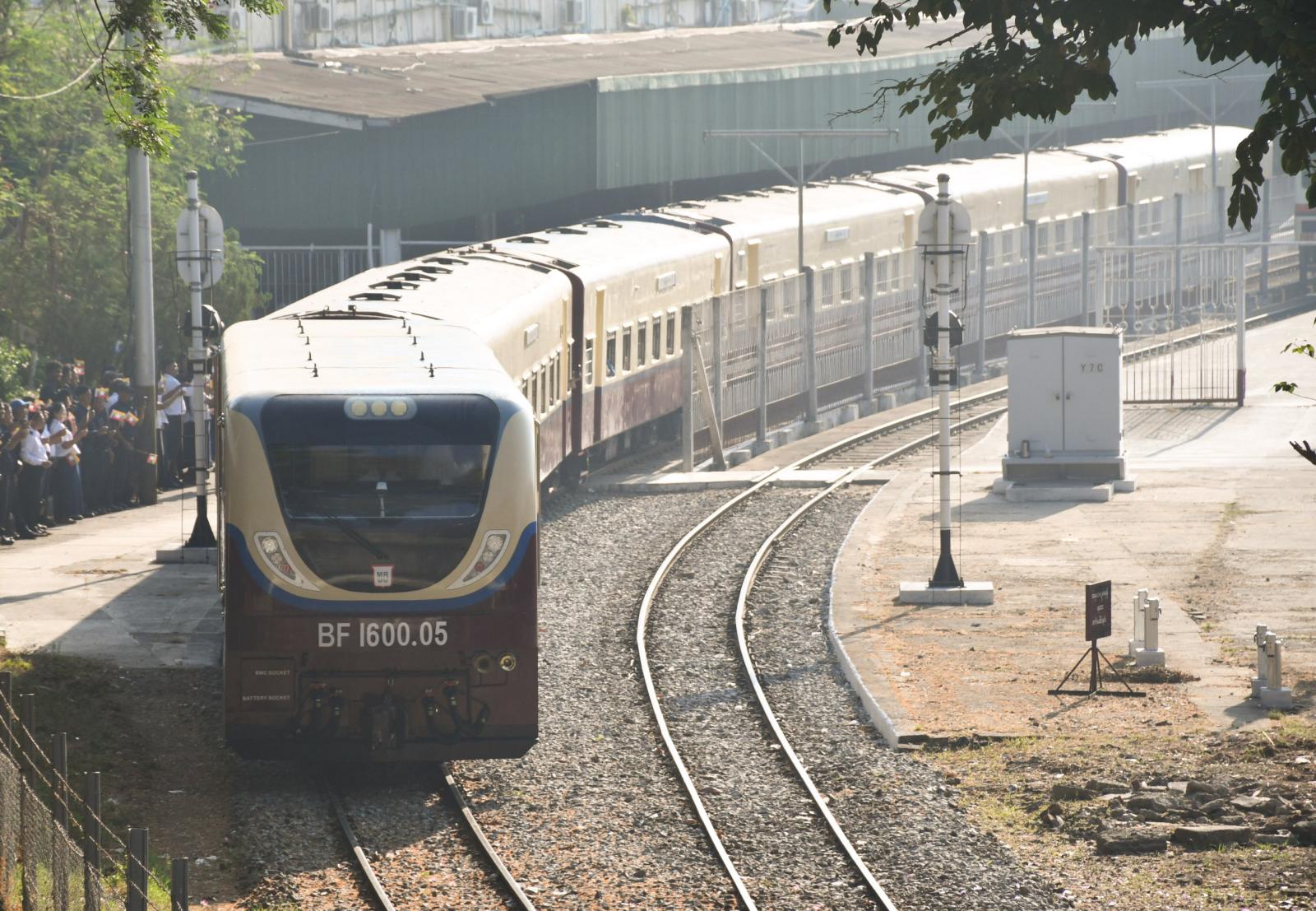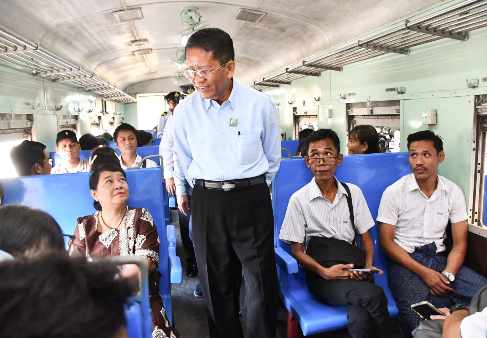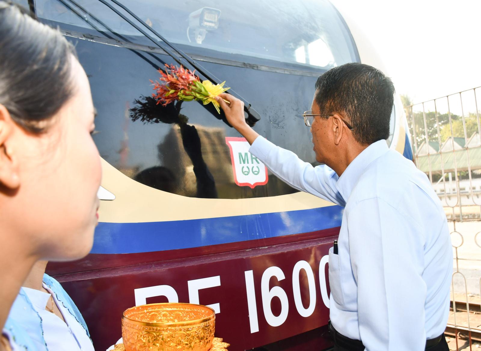 ထို့နောက် ပို့ဆောင်ရေးနှင့်ဆက်သွယ်ရေးဝန်ကြီးဌာန၊ ဒုတိယဝန်ကြီး၊ အမြဲတမ်းအတွင်းဝန်နှင့် မြန်မာ့မီးရထား ဦးဆောင်ညွှန်ကြားရေးမှူးတို့က ရန်ကုန်ဘူတာကြီး အမှတ်(၁)စင်္ကြံမှ ရန်ကုန်မြို့ပတ်ရထားလမ်းပိုင်းတွင် စတင်ပြေးဆွဲထွက်ခွာမည့် ဘက်ထရီလျှပ်စစ်စက်ခေါင်းအား ဖဲကြိုးဖြတ်ဖွင့်လှစ်ပေးပြီး အမွှေးနံ့သာများပက်ဖျန်းပေးသည်။ ဆက်လက်၍ ရထားပေါ်ရှိ ခရီးသွားပြည်သူများအား ရင်းရင်းနှီးနှီး လိုက်လံနှုတ်ဆက်ကာ လိုက်ပါသွားသည့် ခရီးသည်များအား လက်ပြနှုတ်ဆက်ကြသည်။