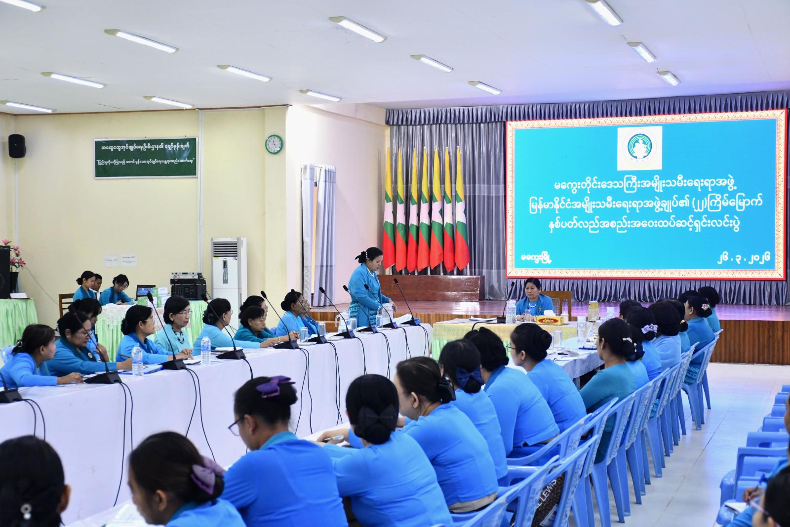 ဆက်လက်၍ တက်ရောက်လာသည့် ခရိုင်အမျိုးသမီးရေးရာအဖွဲ့ဥက္ကဋ္ဌများမှ မိမိတို့ခရိုင်အလိုက် လုပ်ငန်းဆောင်ရွက်နေမှုနှင့် ဆက်လက်ဆောင်ရွက်မည့် အခြေအနေများကို ရှင်းလင်းတင်ပြခြင်း၊ ခရိုင်/မြို့နယ်များတွင် (၃)လပတ်ကာလများအလိုက် (ပထမ၊ ဒုတိယ၊ တတိယ၊ စတုတ္ထ) ဆောင်ရွက်ရမည့် လုပ်ငန်းစီမံချက်များအား ရှင်းလင်းတင်ပြခဲ့ပြီး မကွေးတိုင်းဒေသကြီး အမျိုးသမီးရေးရာအဖွဲ့နာယက ဒေါ်ဝင်းဝင်းမြင့်က တင်ပြချက်များနှင့်စပ်လျဉ်း၍ လိုအပ်သည်များကို ပေါင်းစပ်ညှိနှိုင်းဆောင်ရွက်ပေးခဲ့ပြီး နိဂုံးချုပ်အမှာစကားပြောကြားခဲ့ကာ ခရိုင်/မြို့နယ် အမျိုးသမီးရေးရာအသင်းအဖွဲ့များ အားဂုဏ်ပြုဆုငွေများ ချီးမြှင့်ခဲ့သည်။