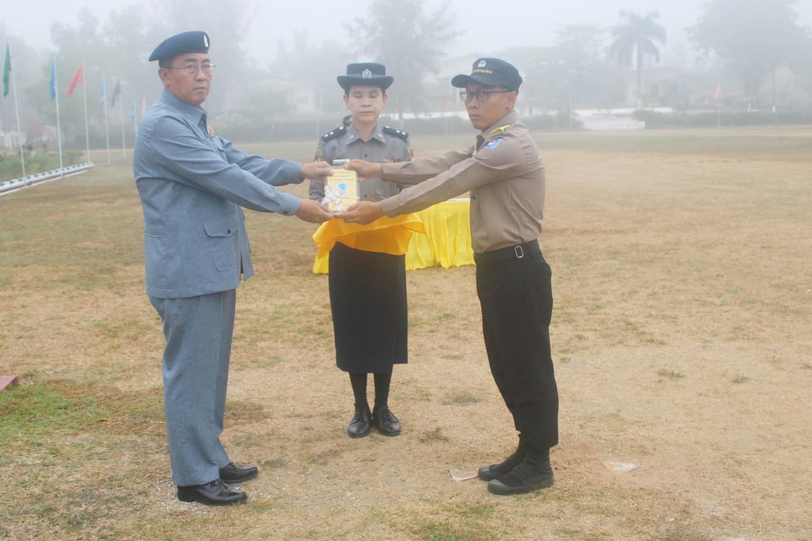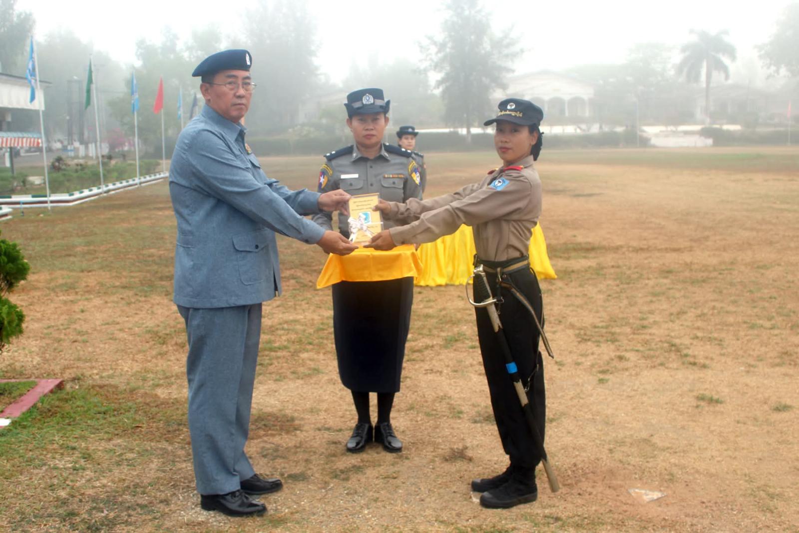 သင်တန်းဆင်း ဂုဏ်ပြုစစ်ရေးပြအခမ်းအနားတွင် ပါမောက္ခချုပ်က သင်တန်းသား စံပြဆုကို သင်တန်းသားအမှတ်-၂၉၅ ဦးအောင်ဘုန်းမြင့်၊ အငယ်တန်းစာရေး၊ အင်းစိန်မြို့နယ်အထွေထွေ အုပ်ချုပ်ရေးဦးစီးဌာန၊ ပြည်ထဲရေးဝန်ကြီးဌာနအားလည်းကောင်း၊ သင်တန်းသူစံပြဆုကို သင်တန်းသူအမှတ်-၇၅ ဒေါ်ထက်ထက်သိန်းဇော်ဝင်း၊ အငယ်တန်းအင်ဂျင်နီယာ-၃၊ သန်လျင်မြို့နယ်စည်ပင်သာယာရေးအဖွဲ့၊ ရန်ကုန် တိုင်းဒေသကြီးအစိုးရအဖွဲ့အားလည်းကောင်း၊ စာပေထူးချွန်ဆုကို သင်တန်းသူအမှတ်-၂၀၈ဒေါ်ရည်မွန်ကျော်၊ အငယ်တန်းအင်ဂျင်နီယာ-၃၊ လှည်းကူးမြို့နယ် စည်ပင်သာယာရေးအဖွဲ့၊ ရန်ကုန်တိုင်းဒေသကြီးအစိုးရအဖွဲ့အား လည်းကောင်း၊ သေနတ်ပစ်ထူးချွန်ဆုကို သင်တန်းသူအမှတ်-၃၇၆ ဦးဝေလင်းဖြိုး၊ အငယ်တန်းစာရေး၊ မြန်မာ့သစ်လုပ်ငန်း၊ သယံဇာတနှင့်သဘာဝပတ်ဝန်းကျင် ထိန်းသိမ်းရေးဝန်ကြီးဌာနအားလည်းကောင်း၊ စစ်ရေးပြထူးချွန်ဆုရရှိသူများနှင့် သင်တန်းဆင်းအောင်လက်မှတ်များကိုလည်းကောင်း ချီးမြှင့်ပေးခဲ့ပြီးနောက် သင်တန်းဆင်းမိန့်ခွန်းပြောကြားရာတွင် နိုင်ငံ့ဝန်ထမ်းတက္ကသိုလ်အနေနဲ့ သင်တန်းသား၊ သင်တန်းသူများကို အဂတိတရားကင်းစင်၍ စိတ်ဓာတ်နှင့် အကျင့်စာရိတ္တကောင်းမွန်တဲ့ ဝန်ထမ်းကောင်းများဖြစ်စေရန်နှင့် နိုင်ငံတော်က မျှော်မှန်းထားတဲ့ ကောင်းမွန်တဲ့ အုပ်ချုပ်ရေး၊ သန့်ရှင်းတဲ့အစိုးရ ဖြစ်ပေါ်လာစေရေးအတွက် နိုင်ငံ့ဝန်ထမ်းများရဲ့ အရည်အသွေးကို မြှင့်တင်လေ့ကျင့်ပေးလျက်ရှိပြီး ပြည်သူတို့ရဲ့ လိုအပ်ချက်ကို အပြည့်အဝဝန်ဆောင်မှုပေးနိုင်တဲ့ အရင်းခံ စိတ်ဓာတ်ရှိသူများ ဖြစ်လာစေရန်၊ နိုင်ငံ့ဝန်ထမ်းများ ဖြစ်သည်နှင့်အညီ မိမိနိုင်ငံနှင့်လူမျိုး အကျိုးစီးပွားကို အစဉ်တစိုက် တိုးတက်အောင် ဆောင်ရွက်ကြရမှာဖြစ်ပြီး မည်သည့်အခြေအနေ မျိုးတွင်မဆို မိမိတို့၏ မူလလုပ်ငန်းတာဝန်ကို ကျေပွန်စွာထမ်းဆောင်ပြီး ပိုမိုခိုင်မာ အားကောင်းတဲ့ နိုင်ငံ့ဝန်ထမ်းအဖွဲ့အစည်းဖြစ်အောင် ဆောင်ရွက်သွားကြရန်၊ ဒို့တာဝန်အရေးသုံးပါးကို ဦးထိပ်ပန်ဆင်ပြီး ပြည်ထောင်စုစိတ်ဓာတ် အစဉ်ထာဝရ ရှင်သန်ကိန်းအောင်းနေစေရေး ဗဟုသုတ၊ အတွေးအခေါ်၊ ဉာဏ်အမြော်အမြင်များ မှန်ကန်မြင့်မား စေရေး၊ အမှန်နှင့်အမှား ဝေဖန်ပိုင်းခြားနိုင်မှုရှိစေရေး၊ စိတ်ဓာတ်ကြံ့ခိုင်ကောင်းမွန်ရေး၊ ဗလငါးတန်နှင့် ပြည့်စုံတဲ့ ထူးချွန်ထက်မြက်သူများ ဖြစ်စေရေး ကြိုးစားဆောင်ရွက်သွားကြရန်၊ နိုင်ငံတော်နှင့် ပြည်သူလူထုရဲ့ အကျိုးစီးပွားကို ဦးထိပ်ပန်ဆင်ပြီး အထက်က ပေးအပ်လာတဲ့ မည်သည့်တာဝန်မျိုးကိုမဆို ကျေပွန်စွာ သယ်ပိုးထမ်းရွက်နိုင်မယ့် နိုင်ငံ့ဝန်ထမ်းများ ဖြစ်လာစေရန်၊ မိမိကိုယ်တိုင်ရွေးချယ်ထားတဲ့ နိုင