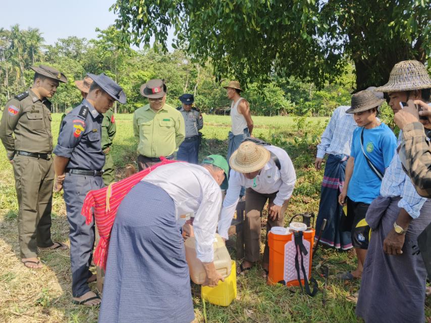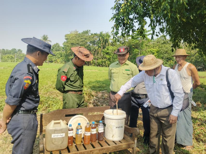 ထိုသို့ သရုပ်ပြရာတွင် မြို့နယ်စိုက်ပျိုးရေးဦးစီးဌာနမှ ဦးစီးအရာရှိ ဦးသက်လွင်က ဌာနဝန်ထမ်းများ စိုက်ကွက်တာဝန်ခံများနှင့်အတူ တုံးကြီးကျေးရွာအုပ်စု၊ သံဘိုကျေးရွာရှိ တောင်သူဦးနိုင်ဦး စိုက်ပျိုးထားသည့် ဆောင်းမြေပဲစိုက်ခင်း (၃)ဧက တွင် နွားကျင်ငယ်ရည် အသုံးပြုရွက်ဖျန်းသဘာဝမြေသြဇာဖျော်စပ်ရန် နည်းလမ်းများအားရှင်းလင်းပြောကြားခဲ့ပြီး လက်တွေ့လုပ်ဆောင်၍ ပက်ဖျန်းသရုပ်ပြဆောင်ရွက်ခဲ့ကြောင်းသိရသည်။