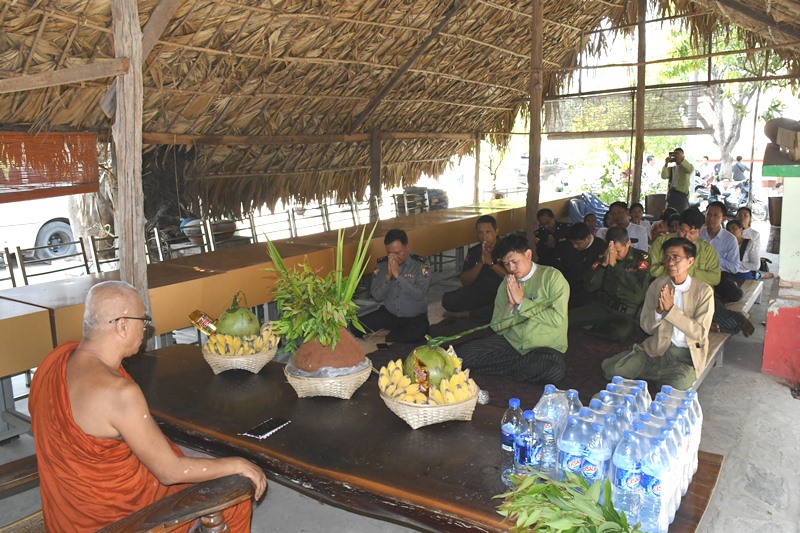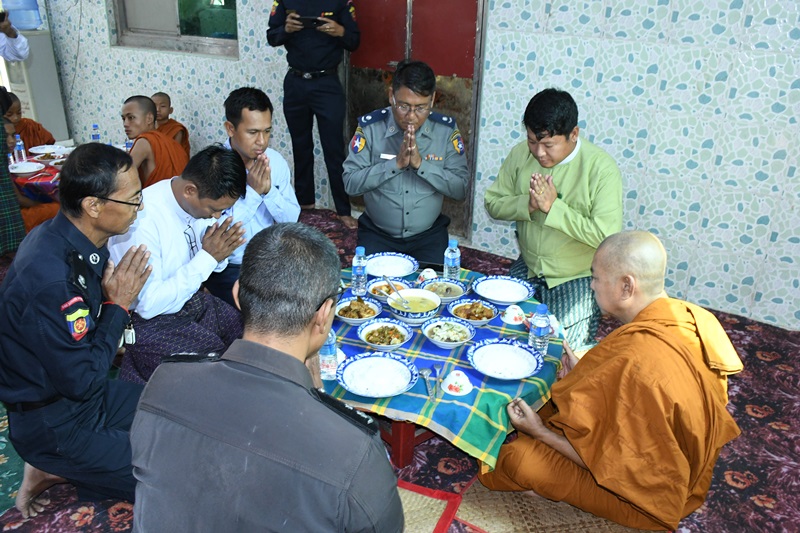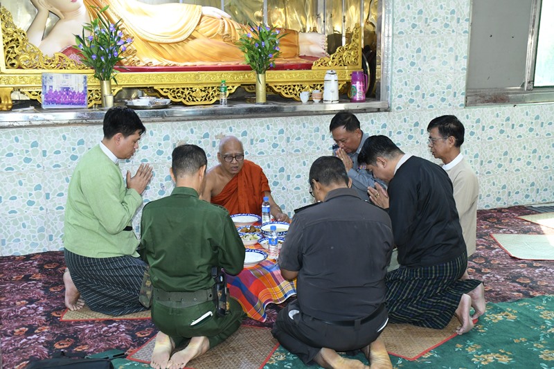 ရှေးဦးစွာ ကျောက်ဆည်ခရိုင်စီမံခန့်ခွဲရေးနှင့် အုပ်ချုပ်ရေးကော်မတီဥက္ကဋ္ဌ ဦးဇော်ဟိန်းအောင်နှင့် အဖွဲ့ဝင်များ၊ ကျောက်ဆည်မြို့နယ် စီမံခန့်ခွဲရေးနှင့်အုပ်ချုပ်ရေးကော်မတီဥက္ကဋ္ဌ ဦးထိုက်ထိုက်ဇော်နှင့်အဖွဲ့ဝင်များ၊ ခရိုင်/မြို့နယ်အဆင့်ဌာနဆိုင်ရာများ၊ ရပ်ကွက်အုပ်ချုပ်ရေးမှူးတို့မှ ကြက်မင်းတွန်ရပ်ကွက်၊ ရွှေစေတီပရိယတ္တိစာသင်တိုက်၌ မြို့နယ်သံဃနာယက ဆရာတော်ကြီးများအား နေ့လည်ဆွမ်းခဲဖွယ်နှင့် လှူဖွယ်ပစ္စည်းများ ဆက်ကပ်လှူဒါန်းခဲ့ပြီး မြို့နယ်သံဃနာယကအဖွဲ့ဥက္ကဋ္ဌ၊ မဟာရွှေစေတီစာသင်တိုက် ပဓာနနာယကဘဒ္ဒန္တပညာသာမိ (မဟာဂန္တဝါစကပဏ္ဍိတ) ဆရာတော်ထံမှ လှူဒါန်းမှုအစုစုတို့အတွက် အနုမောဒနာ ရေစက်သွန်းချတရားနာယူ ကြည်ညိုခဲ့သည်။
