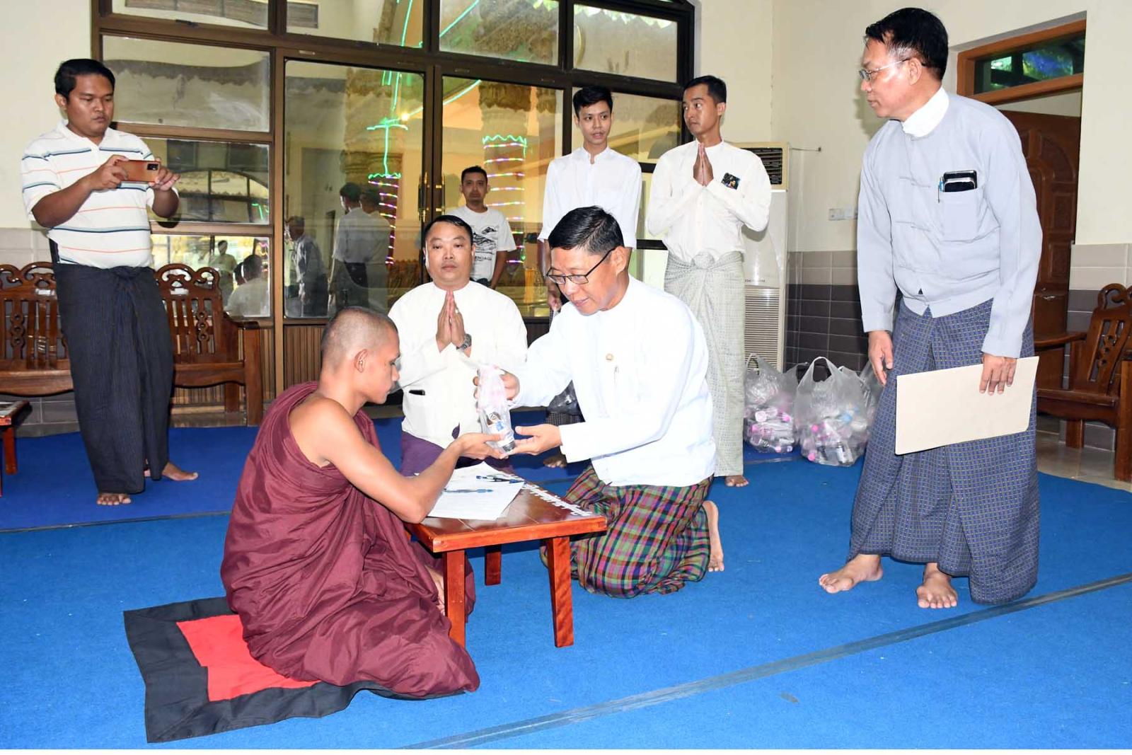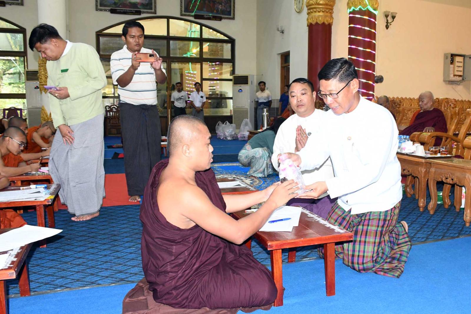 သာသနာရေးနှင့် ယဉ်ကျေးမှုဝန်ကြီးဌာန၊ သာသနာရေးဦးစီးဌာနမှ ၂၃ ရက်မှ ဧပြီ ၄ ရက် အထိ ကျင်းပနေသော အစိုးရဓမ္မာစရိယနှင့်ပါဠိပထမပြန်စာမေးပွဲကို တနင်္သာရီတိုင်းဒေသကြီး ထားဝယ်မြို့ သာသနာ့ဗိမာန်တော်ကြီး၌ကျင်းပလျက်ရှိရာ ယနေ့ မွန်းလွဲပိုင်းတွင် တိုင်းဒေသကြီးမှုရေးရာဝန်ကြီးဦးသက်နိုင်က ထားဝယ်စာဖြေဌာနသို့ လာရောက်ကြည်ညိုစဉ် စာမေးပွဲကြီးကြပ်ရေးဆရာတော်ကြီးများအား လှူဖွယ်ဝတ္ထုပစ္စည်းများ ဆက်ကပ်လှူဒါန်းသည်။