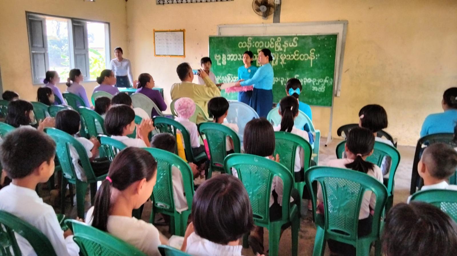 ဆက်လက်၍ မြို့နယ်စီမံခန့်ခွဲရေးနှင့်အုပ်ချုပ်ရေးကော်မတီဥက္ကဋ္ဌ ဦးသန်းထိုက်အောင်၊ မြို့နယ်ပညာရေးမှူးကိုယ်စား ဦးဇာဏီမောင် ဒုတိယမြို့နယ်ပညာရေးမှူး (စီမံ / ဘဏ္ဍာ) နှင့် မြို့နယ်အမျိုးသမီးရေးရာအဖွဲ့ဥက္ကဋ္ဌ ဒေါ်ခိုင်စန္ဒာထွန်းနှင့် အဖွဲ့ဝင်များ၊ မြို့နယ်မိခင်နှင့်ကလေးစောင့်ရှောက်အသင်းဝင်များက အခြေခံဗုဒ္ဓဘာသာယဥ်ကျေးလိမ္မာသင်တန်း တက်ရောက်ကြသော ကျောင်းသား၊ ကျောင်းသူများအား သင်တန်းဆင်းဂုဏ်ပြုမှတ်တမ်းလွှာများ ပေးအပ်ခဲ့သည်။