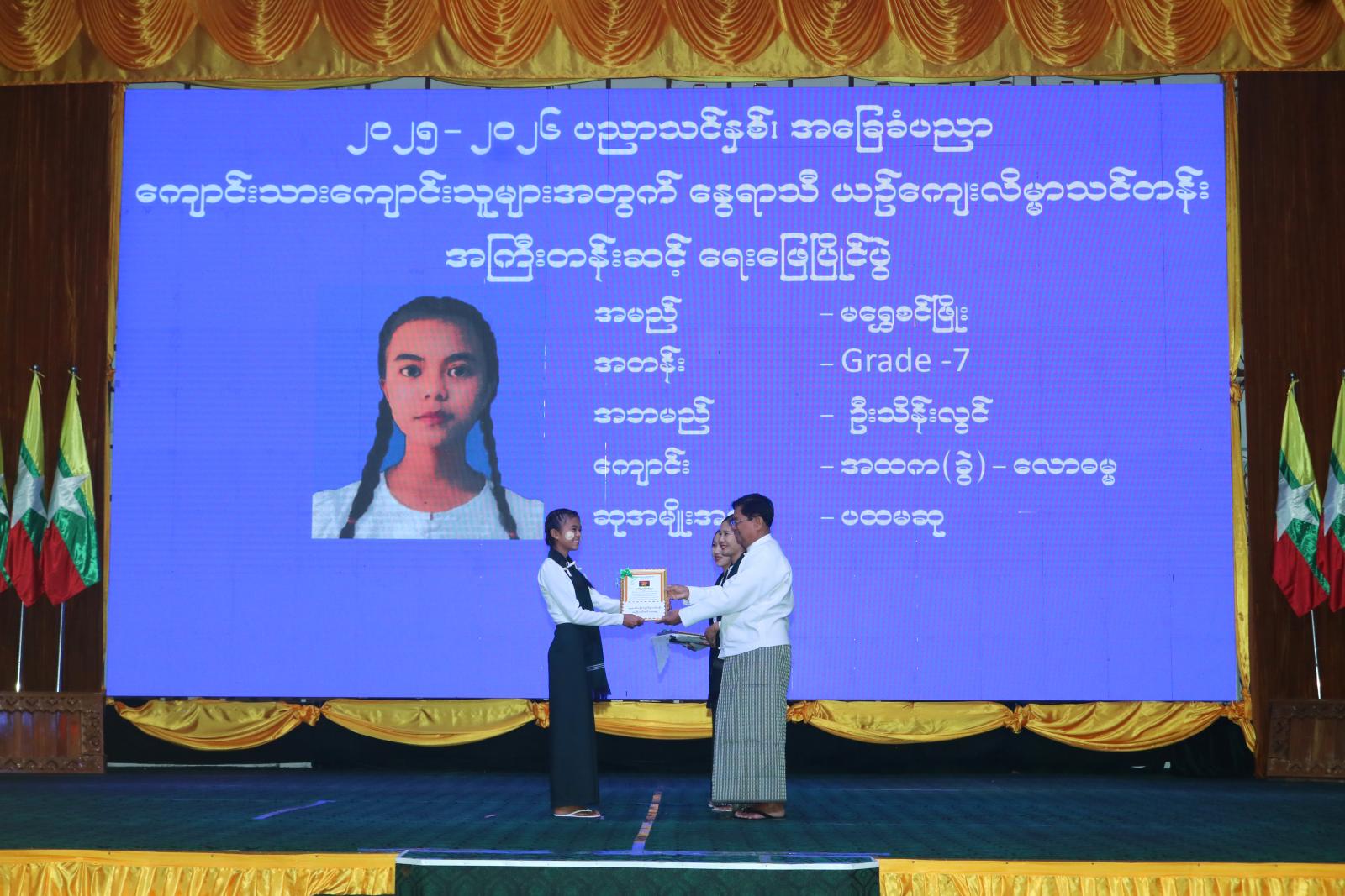 ဆက်လက်၍ ဒေသကွပ်ကဲရေးမှူး၊ ပြည်နယ်တရားသူကြီးချုပ်နှင့် ပြည်နယ်အစိုးရအဖွဲ့ဝင်များက ဆုရကျောင်းသား၊ ကျောင်းသူများအား ဆုများအသီးသီးပေးအပ်ချီးမြှင့်ပြီး ပြည်နယ်ပညာရေးမှူးက သင်တန်းဆင်းလက်မှတ်များကို ပေးအပ်သည်။