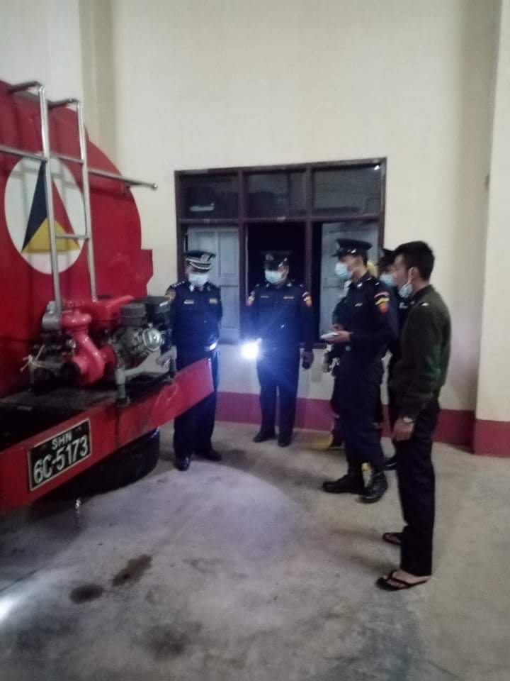 ထိုသို့ ကြည့်ရှုစစ်ဆေးရာတွင် “ရှမ်းပြည်နယ် ပြည်နယ်မီးသတ်ဦးစီးမှူး ညွှန်ကြားရေးမှူး ဦးအောင်ဝင်းစိန်က တာလေနယ်မြေ မီးသတ်စခန်းကို ယမန်နေ့ ညနေ ၆ နာရီခွဲ အချိန် ရောက်ရှိပြီး တပ်ဖွဲ့ဝင်များနှင့်တွေ့ဆုံ၍ တပ်ဖွဲ့ဝင်များ လုပ်ဆောင်ရမည့် လုပ်ငန်းစဉ်များ လမ်းညွှန်မှာကြားခြင်း၊ မီးသတ်ရေယာဉ်၊ မီးသတ် စက်ပစ္စည်းကိရိယာများနှင့် တပ်ဖွဲ့ဝင်များ၏ လုပ်ငန်းဆောင်ရွက်နေမှု အခြေအနေတွေကို ကြည့်ရှုစစ်ဆေး ခဲ့ပါတယ်” ဟု နယ်မြေမီးသတ်စခန်းမှ ဦးစီးမှူး ဦးလင်းဝင်းထိုက်က ပြောသည်။