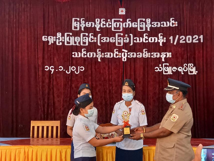 မွန်ပြည်နယ်၊ သံဖြူဇရပ်မြို့တွင် မွန်ပြည်နယ် ကြက်ခြေနီအသင်းနှင့် သံဖြူဇရပ် မြို့နယ် ကြက်ခြေနီအသင်းတို့ ကြီးမှူးဖွင့်လှစ်သည့် ရှေးဦးပြုစုခြင်း(အခြေခံ)သင်တန်း ၁/၂၀၂၁ဆင်းပွဲကို မြို့နယ်အထွေထွေအုပ်ချုပ်ရေးဦးစီးဌာန ဘုရင့်နောင် ခန်းမ၌ ဇန်နဝါရီ၁၄ရက်နံနက်၁၀နာရီကကျင်းပသည်။