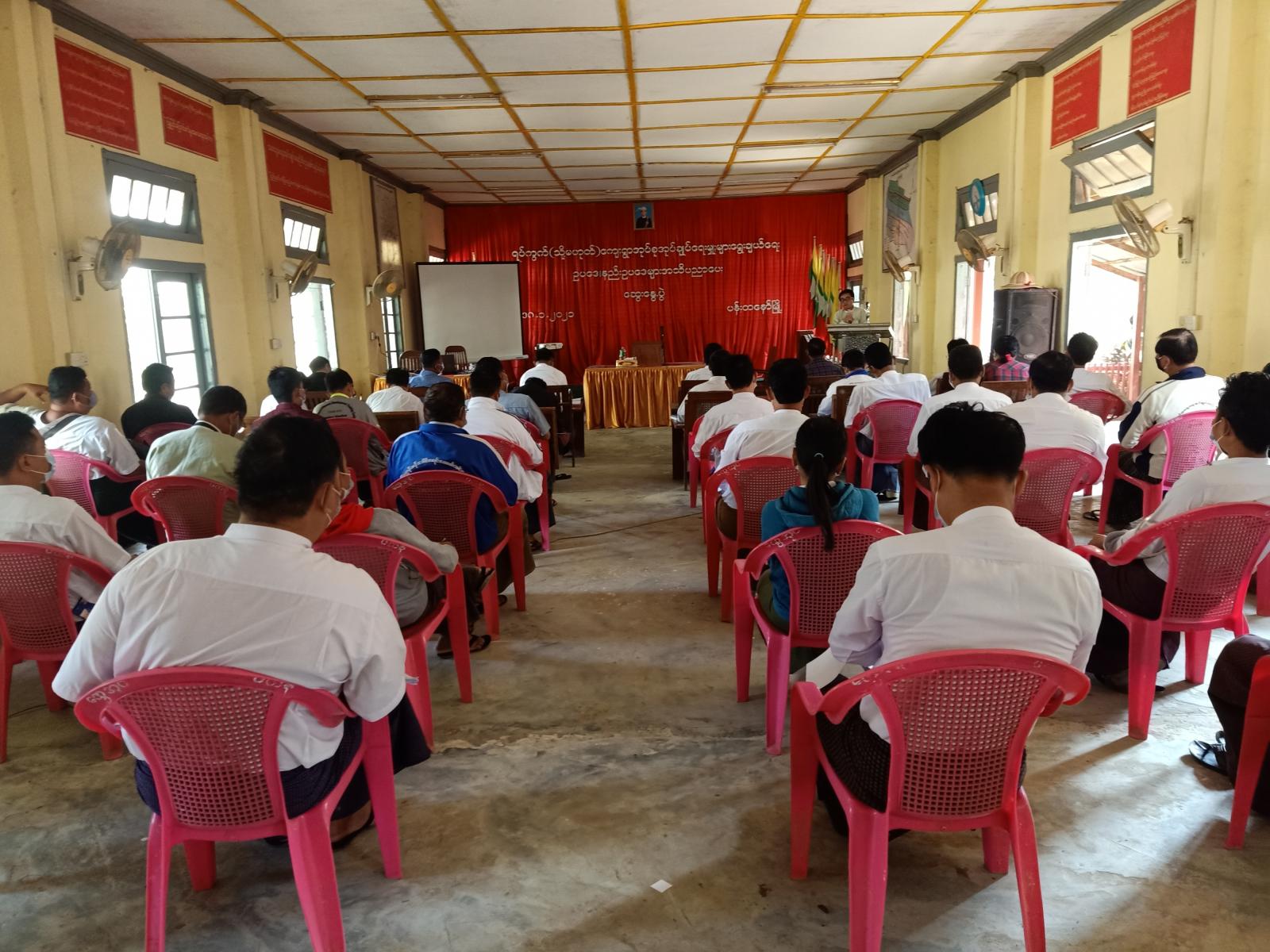 ရှေးဦးစွာ မြို့နယ်အုပ်ချုပ်ရေးမှူး ဦးရဲမင်းအောင်က ရပ်ကွက်/ ကျေးရွာအုပ်စု အုပ်ချုပ်ရေးမှူး များအား ဥပဒေနှင့်အညီ ရွေးချယ်နိုင်ရေးအတွက် မြို့နယ်အဆင့်ဌာနဆိုင်ရာ အကူအညီ ပေးရေးအဖွဲ့များအား တတိယအကြိမ် ပြင်ဆင်ရေးဆွဲ ထားသည့် ရပ်ကွက ်(သို့မဟုတ်) ကျေးရွာအုပ်စု အုပ်ချုပ်ရေး ဥပဒေ၊ နည်းဥပဒေများကို အသိပညာပေး ဆွေးနွေးရခြင်းဖြစ်ကြောင်း ပြောကြားသည်။