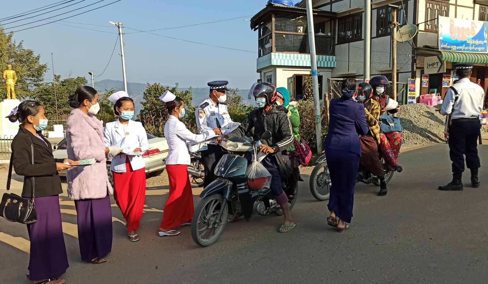 မင်းတပ်မြို့ မိခင်နှင့်ကလေးစောင့်ရှောက်ရေး အသင်းဝင်များ၊ အမျိုးသမီးရေးရာ အဖွဲ့ဝင်များ၊ ကျန်းမာရေး ဝန်ထမ်းများနှင့် ယာဉ်ထိန်းရဲ တပ်ဖွဲ့ဝင်များ ပူးပေါင်းပြီး မြို့မစျေးရှိ စျေးရောင်း/စျေးဝယ် ပြည်သူများအား "နေ့စဉ်ဘဝမှာ ခပ်ခွာခွာနေပါ" ကိုဗစ်-၁၉ ရောဂါ အသိပညာပေး လက်ကမ်းစာစောင်များနှင့် Maskများ အခမဲ့ဖြန့်ဝေခြင်းကို ယနေ့ နံနက် ၉ နာရီအချိန်တွင် ဆောင်ရွက်ခဲ့ကြောင်းသိရသည်။