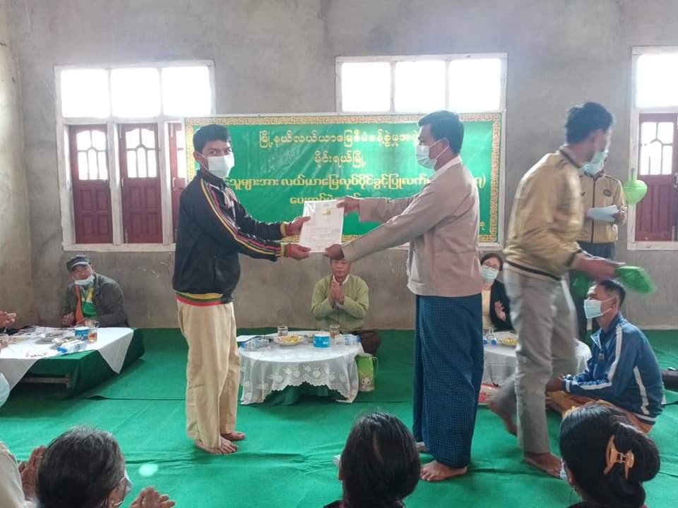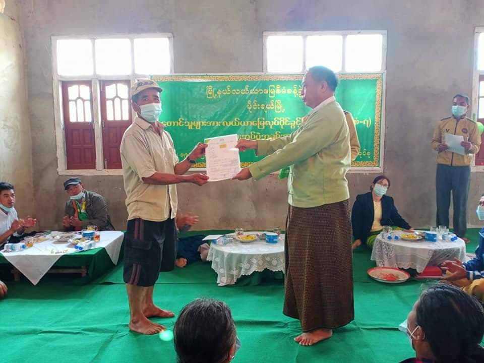 တောင်သူများအတွက် လယ်ယာမြေလုပ်ပိုင်ခွင့်ပြုလက်မှတ် ပုံစံ(၇)များ ထုတ်ပေးခြင်း အခမ်းအနားကို ယမန်နေ့ညနေ (၃)နာရီ က မိုင်းရယ်မြို့နယ်၊ ကောင်းမောင်ကျေးရွာအုပ်စုတွင် ပြုလုပ်သည်။