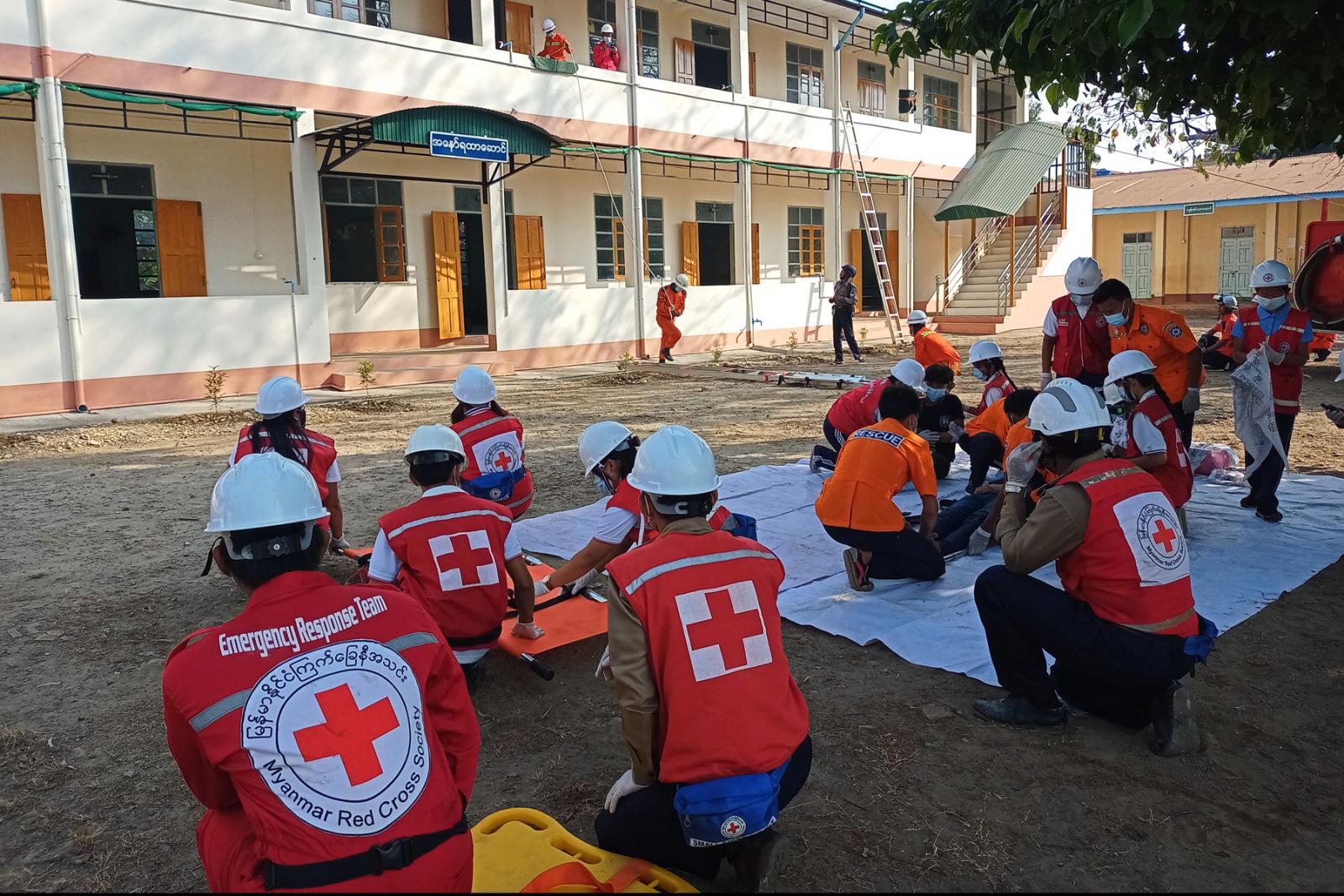 အဆိုပါ ငလျင်ဘေးအန္တရာယ် သရုပ်ပြသခြင်း အခမ်းအနားသို့ မုဒုံမြို့နယ်အုပ်ချုပ် ရေးမှူး ဦးသက်ဇော်ဦး၊ မြို့နယ် ရဲတပ်ဖွဲ့မှူးရဲမှူ ဝင်းဇော်၊ မြို့နယ်မီးသတ်ဦးစီးမှူး ဦးစောစိုးစိုးမြင့်နှင့် မြို့နယ်ကြက်ခြေနီအသင်းဥက္ကဋ္ဌ ဦးအောင်ဗိုလ် ကျော်တို့ တက်ရောက်ခဲ့ပြီး သရုပ်ပြလေ့ကျင့်မှု အခမ်းအနားတွင် ငလျင်လှုပ်မှုကြောင့် ပြိုကျပျက်စီး နေသော အဆောက် အအုံအတွင်းသို့ ပိတ်မိနေသူများအား မီးသတ်တပ်ဖွဲ့ဝင်များက ဝင်ရောက် ရှာဖွေခြင်း၊ ကြက်ခြေနီ တပ်ဖွဲ့ဝင်များမှ ပိတ်မိနေသူများအား ကျန်းမာရေးစောင့်ရှောက် ပေးခြင်း ငလျင်ဘေးဒဏ်ကြောင့် ထိခိုက်ဒဏ်ရာ ရရှိသူများအား ကူညီဆောင်ရွက်ပေးခြင်း ၊ပြိုကျနေသောကွန်ကရစ်တုံးများ၊ ထုတ်တန်းများကြားတွင် ပိတ်မိလူနာများ အားရှာဖွေ ကယ်ဆယ်ခြင်းနှင့် ဘေးလွတ်ရာသို့ ကယ်ဆယ်ဆောင်ရွက်ပေးခြင်း၊ အဆောက်အအုံ အမြင့်ထပ်တွင် ပိတ်မိနေ သူများအား ကယ်ဆယ်နိုင်ရန်အတွက် မီးသတ်လှေကားအသုံးပြု၍ ပြိုကျနေသော အဆောက်အအုံသို့ ရှာဖွေကယ် ဆယ်ရေးလုပ်ငန်းများ ဆောင်ရွက်ခြင်း၊ သတိလစ်နေသူများ အသက်ကယ်ကြိုး အသုံးပြု၍ ပိတ်မိနေ သူများအား ကယ်ဆယ် ဆောင်ရွက်ခြင်း၊ အထပ်မြင့်အဆောက်အအုံမှ နည်းအမျိုးမျိုးဖြင့် ကယ်ထုတ်သောပိတ်မိ လူနာများအား ကြက်ခြေနီတပ်ဖွဲ့ဝင်များနှင့် အရေးပေါ်ကယ်ဆယ်ရေး အဖွဲ့တို့မှရှေးဦးသူနာ ပြုစုနည်းဖြင့်ပြုစုပြီး လိုအပ်ပါက ပြည်သူ့ဆေးရုံသို့ ပို့ဆောင်ပေးခြင်းလုပ်ငန်းများကို သရုပ်ပြ လေ့ကျင့်ဆောင်ရွက်ကြကြောင်း သိရှိရသည်။