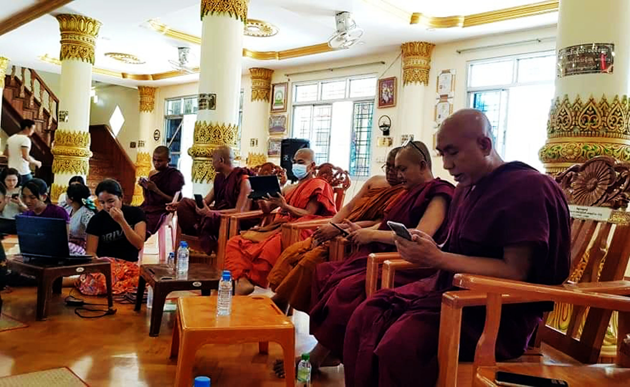 ကော့သောင်းမြို့နယ်လုံးဆိုင်ရာ ဓမ္မစကူးဖေါင်ဒေးရှင်းမှ မြို့နယ်အတွင်းရှိ ဓမ္ပစကူးကျောင်းသား ကျောင်းသူများအား zoom application သုံးစွဲကာ အွန်လိုင်းစနစ်ဖြင့် သင်ခန်းစာများပို့ချသင်ကြားပေးနိုင်ရေး application အသုံးပြုနည်းဆိုင်ရာနည်းလမ်းများအားမိတ်ဆက်သည့်အစီအစဉ်အား ယမန်နေ့မွန်းလွဲပိုင်းက ကော့သောင်းမြို့၊ နိဗ္ဗာန်အေးဘုန်းတော်ကြီးကျောင်းတွင်ပြုလုပ်ရာ မြို့နယ်လုံးဆိုင်ရာ ဓမ္မစကူးဖေါင်ဒေးရှင်း အကျိုးတော်ဆောင်ဆရာတော်သံဃာတော်များ၊ သင်တန်းနည်းပြများတက်ရောက်ကြသည်။