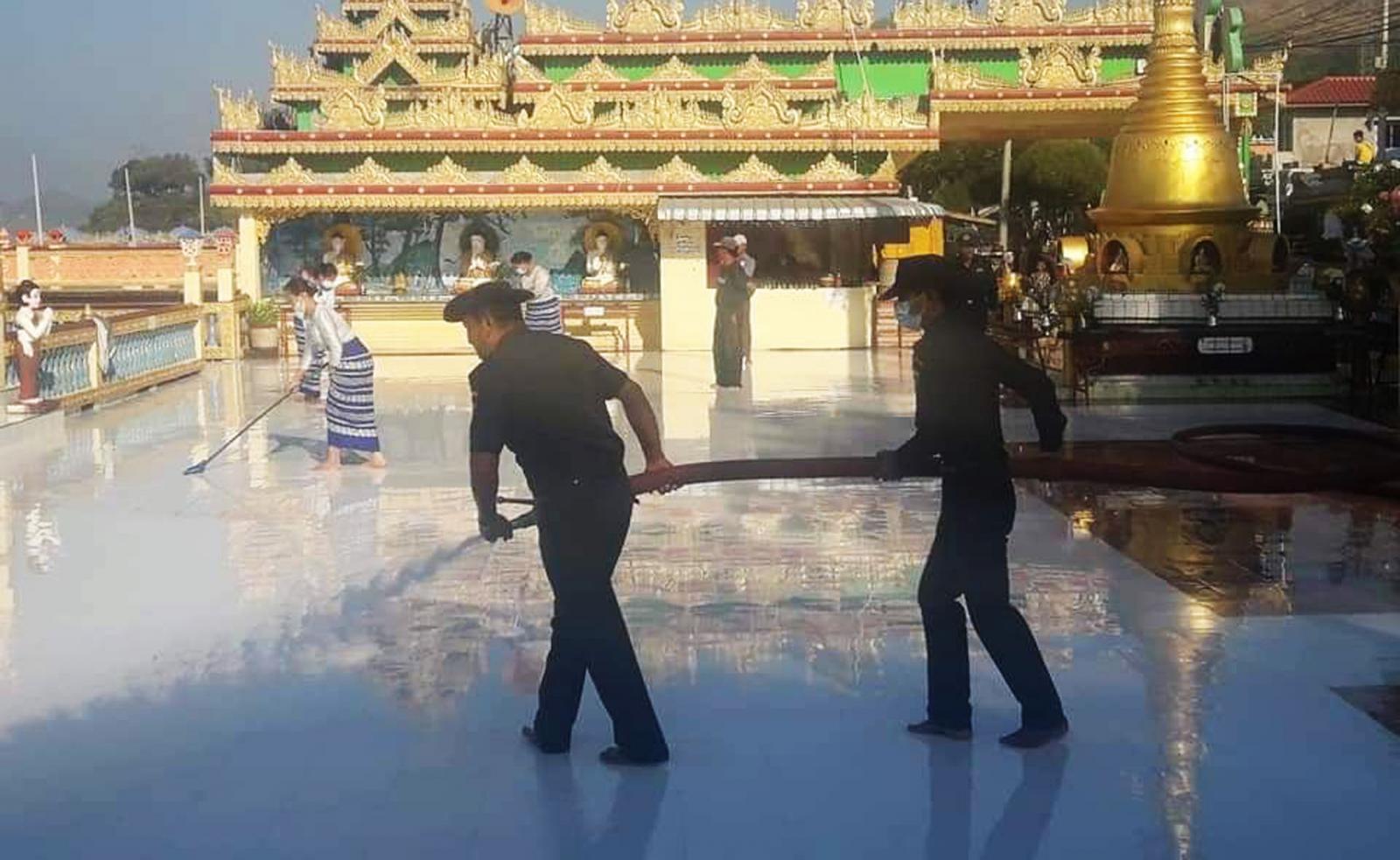 ကိုဗစ်၁၉ ကာလအတွင်း ရောဂါထိန်းချုပ်ရေး လုပ်ငန်းများ ထိရောက်မှုရှိစေရေး စေတီဘုရားပုထိုးများ ယာယီပိတ်သိမ်းထားရာ ဘုရားဖူးပြည်သူများလာရောက်ဖူးမျှော်လည်ပတ်ခွင့်မပြုသဖြင့် လူသူသွားလာမှုမရှိ ဘုရားရင်ပြင်နှင့်ပရဝုဒ်အတွင်း ဖုန်နှင့် အညစ်အကြေးများ တစ်စတစ်စ စုပုံလာနေသဖြင့် ဘုရားရင်ပြင်တော် အနှံ့ သန့်ရှင်းစေရေး မီးသတ်ရေသယ်ယာဉ်များ အသုံးပြု ကာ ဆေးကြောသန့်စင်ပေးခြင်း ၊ ဆင်းတုတော်များအား သန့်စင်မွမ်းမံပေးခြင်း၊ သာသနိကအဆောက်အအုံများနှင့် ပရဝုဒ်အတွင်း အမှိုက်သရိုက်များ ရှင်းလင်းဖယ်ရှားပေး ခြင်းလုပ်ငန်းများကို ကော့သောင်းခရိုင်မီးသတ်ဦးစီးဌာနမှ လက်ထောက်ညွှန်ကြားရေးမှူး ဦးအောင်ငြိမ်းဦး က သန္ဓေတပ်ဖွဲ့ဝင်များနှင့်မိသားစုများ စုပေါင်း ဒါနပြုဆောင်ရွက်ပေးခြင်း ဖြစ်ကြောင်း သိရသည်။
