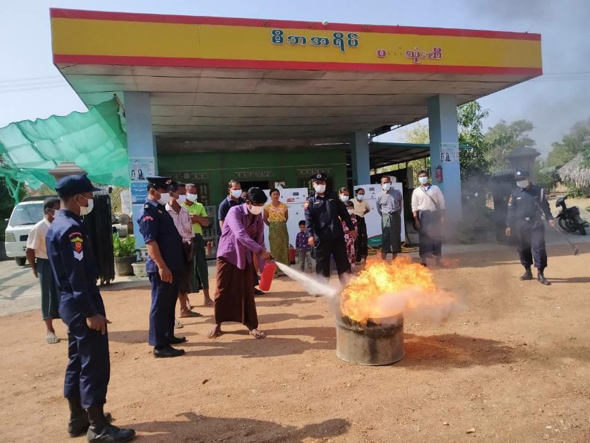မီးဘေးအန္တရာယ်ကြိုတင်ကာကွယ်ရေး အသိပညာပေးလုပ်ငန်းများဆောင်ရွက်ရာတွင် မြို့နယ် မီးသတ်ဦးစီးမှူး ဦးစီးအရာရှိ ဦးရဲအောင်၏လမ်းညွှန်မှုဖြင့် မီးသတ်တပ်ဖွဲ့ဝင်များက မီးငြိမ်းသတ်နည်း လက်တွေ့သရုပ်ပြခြင်းနှင့် ဇာတ်တိုက်လေ့ကျင့်ခြင်းတို့ကိုပါ ဆောင်ရွက် ပေးခဲ့ပြီး ရပ်ကွက်အုပ်ချုပ်ရေးမှူးများနှင့် စက်သုံးဆီရောင်းချနေသော ဆီဆိုင်ပိုင်ရှင်နှင့် ဝန်ထမ်း များက ကိုယ်တိုင်ပါဝင် သရုပ်ပြကာ လက်တွေ့မီးငြိမ်းသတ်ခြင်းများ ပြုလုပ်ခဲ့ကြကြောင်း သိရသည်။