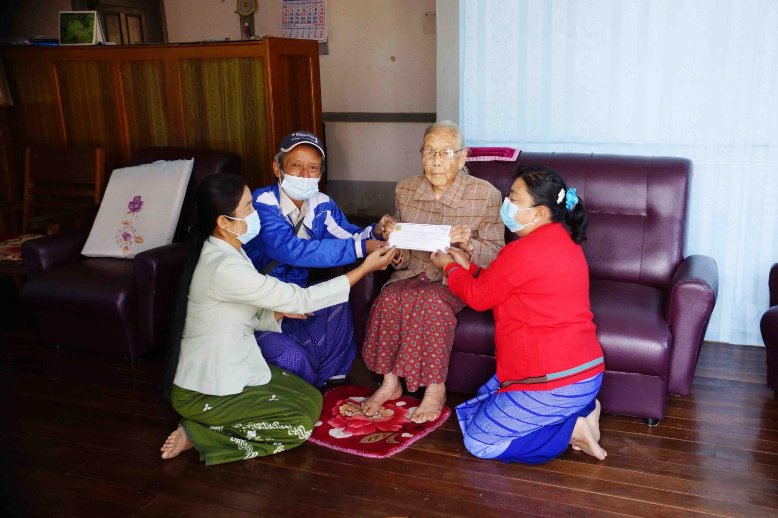 ထောက်ပံ့ငွေပေးအပ်ရာတွင် လွိုင်ကော်ခရိုင် လူမှုဝန်ထမ်းရုံးမှ ဦးစီးအရာရှိ ဒေါ်တင်မာဝင်း၊ ရပ်ကွက်အုပ်ချုပ်ရေးမှူး ဦးစိန်လင်းနှင့် တာဝန်ရှိသူတို့က အသက်(၈၅)နှစ်နှင့် အထက် ဘိုး/ဘွားများအား ထောက်ပံ့ငွေ ကျပ်သုံးသောင်းကို အုပ်ချုပ်ရေးမှူးရုံးနှင့် နေအိမ်များသို့ သွားရောက်ပေးအပ်ခဲ့ကြောင်း၊ ဒီးမော့ဆို၊ ဖရူဆို၊ ရှားတော မြို့နယ်များတွင်လည်း သွားရောက် ထောက်ပံ့ပေးကြောင်း သိရသည်။