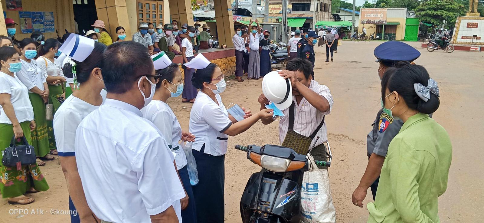 မြို့နယ် ကိုဗစ်-၁၉ ရောဂါ ထိန်းချုပ်ရေးနှင့်အရေးပေါ်တုံ့ပြန်ရေးကော်မတီ၊ မြို့နယ်ကျန်းမာရေး ဦးစီးဌာန၊ ဌာနဆိုင်ရာများ၊ မီးသတ်တပ်ဖွဲ့ဝင်များ၊ ရဲတပ်ဖွဲ့ဝင်များနှင့် မြို့နယ်စည်ပင်သာယာရေး ဝန်ထမ်းများ ပူးပေါင်း၍ နေအိမ်ပြင်ပသို့ ထွက်ခွာလာသူများကို နှာခေါင်းစည်းများ စနစ်တကျ တပ်ဆင်သွား လာမှု ရှိ/မရှိကို ရှောင်တခင်စစ်ဆေးပြီး နှာခေါင်းစည်း တပ်ဆင်ခြင်း မရှိသူများနှင့် ဟောင်းနွမ်းနေသည့် နှာခေါင်းစည်းများ တပ်ဆင်ထားသူများကို အခမဲ့ဖြန့်ဝေပေးကာ ချက်ချင်း တပ်ဆင်စေခဲ့သည်။