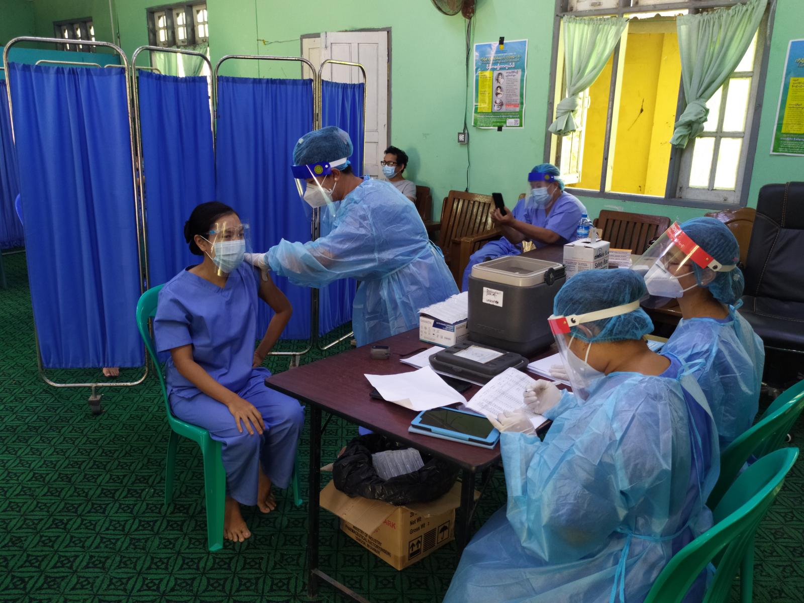 ထို့သို့ ကာကွယ်ဆေးထိုးနှံပေးရာတွင် ကျန်းမာရေးနှင့်အားကစားဝန်ကြီးဌာနက ချမှတ်ထားသော လမ်းညွှန်ချက်များနှင့်အညီ လူစုလူဝေး မဖြစ်ပေါ်စေရေးအတွက် အထူးအလေးထား ဆောင်ရွက် ထားပြီး ဆေးထိုးနှံရန် လာရောက်သည့် ကျန်းမာရေးဝန်ထမ်းများအား ပထမသုတ်၊ ဒုတိယသုတ်၊ တတိယသုတ် ဟူ၍ အချိန်များခွဲဝေ၍ ထိုးနှံရန် လာရောက်ကြစေကြောင်း သိရှိရသည်။