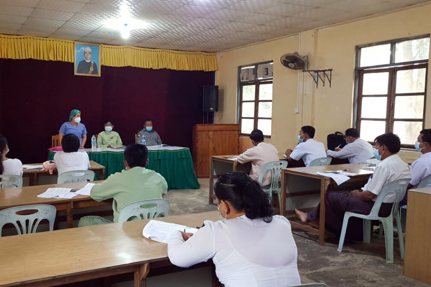 အစည်းအဝေးတွင် မြို့နယ် ကိုဗစ်-၁၉ ရောဂါ ကာကွယ်ထိန်းချုပ်ကုသရေးဆိုင်ရာ လုပ်ငန်း ကော်မတီ ဥက္ကဋ္ဌ ဦးမျိုးသိုက်ထွန်းက ကာကွယ်ဆေးထိုးနှံရေးအတွက် မြို့နယ်အတွင်းရှိ (၁၈) နှစ် ပြည့်ပြီးသူလူဦးရေ စာရင်း ကောက်ယူထားရှိမှု အခြေအနေနှင့် ပတ်သက်၍ ရှင်းလင်းပြောကြားပြီး မြို့နယ်ကျန်းမာရေး ဦးစီးဌာနမှ မြို့နယ်ဆရာဝန်ကြီး ဒေါက်တာသူဇာဝင်းက ကာကွယ်ဆေး ထိုးမည့် စုရပ်များကြိုတင်ပြင်ဆင် ဆောင်ရွက် ထားရှိမှုအခြေအနေ၊ ဆေးထိုးပေးမည့်အဖွဲ့များ ဖွဲ့စည်းထားရှိမှု အခြေအနေ၊ကာကွယ် ဆေးထိုး ပြီးသွားပါက ပြည်သူများအနေဖြင့် လိုက်နာ ဆောင်ရွက်ရမည့် အခြေအနေများ၊ ဆေးထိုးနေစဉ်အတွင်း အရေးပေါ် အခြေအနေဖြစ်ပေါ်လာပါက ကြိုတင်ပြင်ဆင်းထားရှိမှုအခြေအနေတို့ကို ရှင်းလင်းဆွေးနွေး ပေးခဲ့သည်။