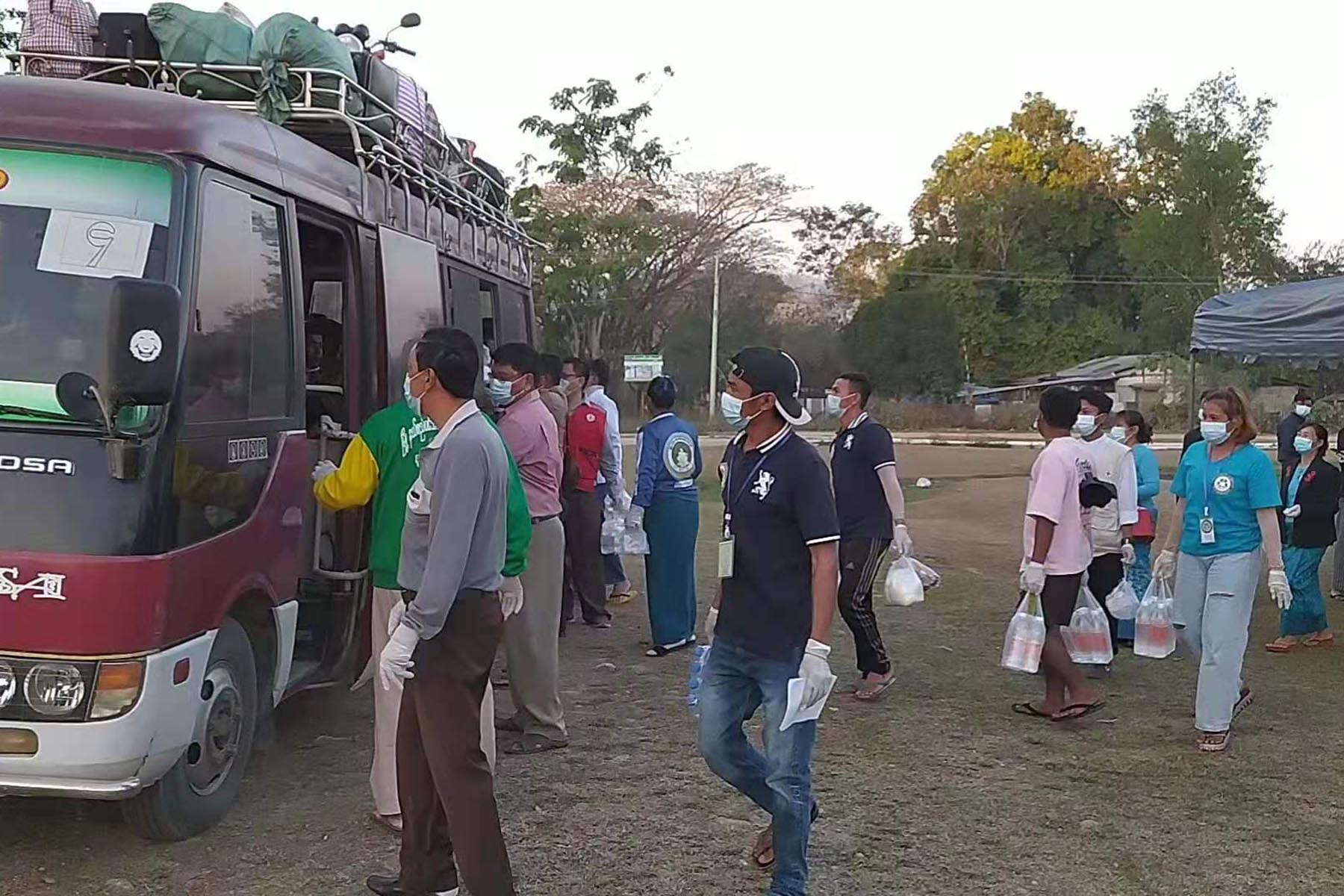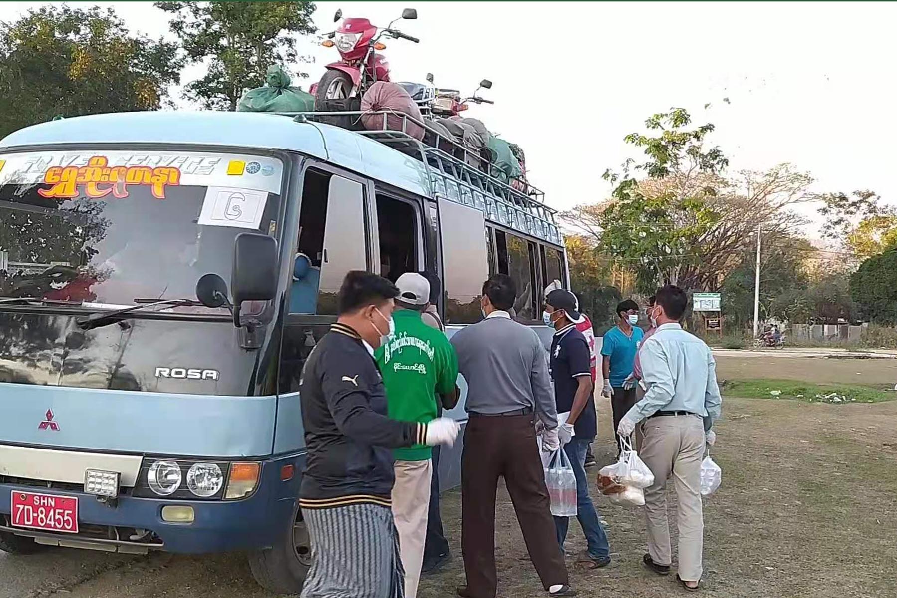နေရပ်ပြန် မြန်မာအလုပ်သမားများကို ပြန်လည်ပို့ဆောင်မည့် မော်တော်ယာဉ်များသည် မိုင်းယောင်းမြို့နယ်သို့ ညနေ ၅ နာရီတွင် ရောက်ရှိရာ မြို့နယ်အုပ်ချုပ်ရေးမှူး ဦးညီညီဝင်း နှင့် ဌာနဆိုင်ရာများ၊ ရဲတပ်ဖွဲ့၊ မြို့မိမြို့ဖများ၊ ကြက်ခြေနီသူနာပြုတပ်ဖွဲ့၊ အမျိုးသမီးရေးရာအဖွဲ့၊ မျိုးဆက်သစ်ရောင်နီပရဟိတ လူမှုကူညီရေးအသင်းနှင့် ဒေသခံပြည်သူများက နေရပ်ပြန်မြန်မာအလုပ်သမားများအား ထမင်းထုပ်နှင့် သောက်ရေသန့် ဘူးများကို ပေးဝေ ခဲ့ကြသည်။