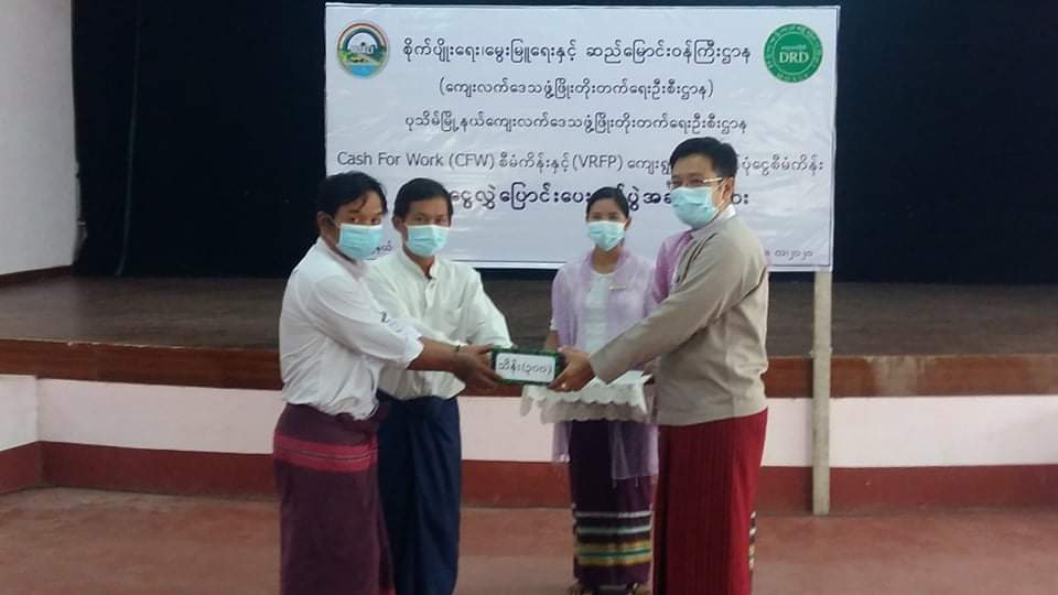 ဆက်လက်၍ တိုင်းဒေသကြီးလွှတ်တော်ကိုယ်စားလှယ် ဦးအောင်သူထွေး၊ ပုသိမ်မြို့နယ် အုပ်ချုပ်ရေးမှူး ဦးရာဇာအေး၊ မြို့နယ်ဦးစီးမှူး ဦးဌေးနိုင်နှင့် တာဝန်ရှိသူများက(VRFP) ကျေးရွာမတည် ရန်ပုံငွေ ကျေးရွာနှစ်ခုအတွက် သိန်း (၅၀၀)နှင့် CFW စီမံကိန်းကျေးရွာ (၆) ရွာအတွက် တစ်ရွာလျှင် သိန်း(၁၀၀) ကျပ်နှုန်းဖြင့် လွှဲပြောင်း ထောက်ပံ့ပေးအပ်ရာ ကျေးရွာ ကိုယ်စားလှယ်များက လက်ခံရယူခဲ့ကြ သည်။ ယနေ့တွင် စီမံကိန်းကျေးရွာ ၈ ရွာအတွက် ရန်ပုံငွေကျပ်စုစုပေါင်း သိန်း ၁၁၀၀ ကိုလွှဲပြောင်းပေးအပ်ခဲ့ကြောင်း သိရသည်။