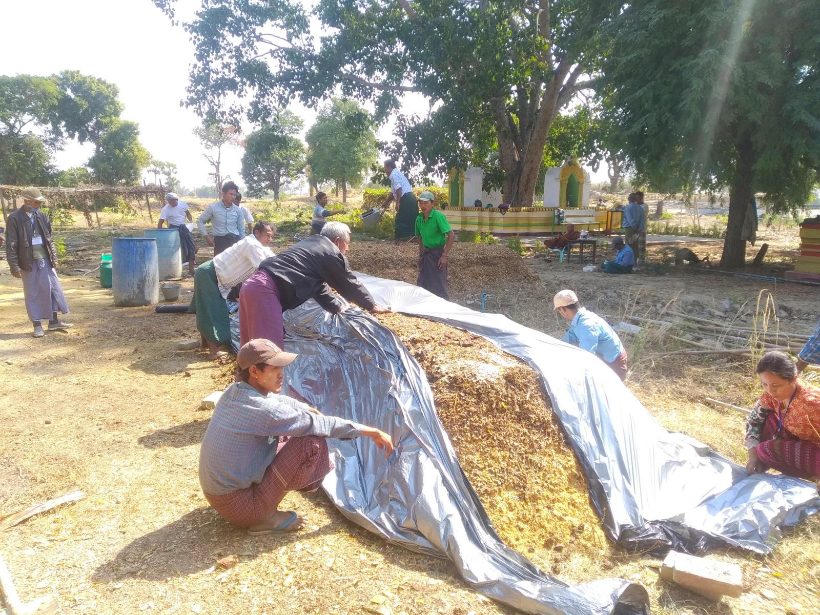 EM ဘိုကာရှီမြေဆွေးကို နွားချေး၊ ဖွဲနု၊ အသင့်သုံး EM(အကျိုးပြုအဏုဇီဝပိုးမွှားရည်)၊ တင်လဲရည်၊ နှမ်းရိုး၊ ဆန်ကွဲ၊ စက်ဖွဲပြာ၊ နှမ်းဖတ်တို့ကို ရေအစိုဓာတ် (၄၀) ရာခိုင်နှုန်း အသုံးပြုကာ အလျား (၁၈) ပေ၊ အနံ (၆) ပေနှင့် အမြင့်(၃)ပေရှိ မြေဆွေးပုံများကို ပြုလုပ်အသုံးပြုကြကြောင်း သိရသည်။