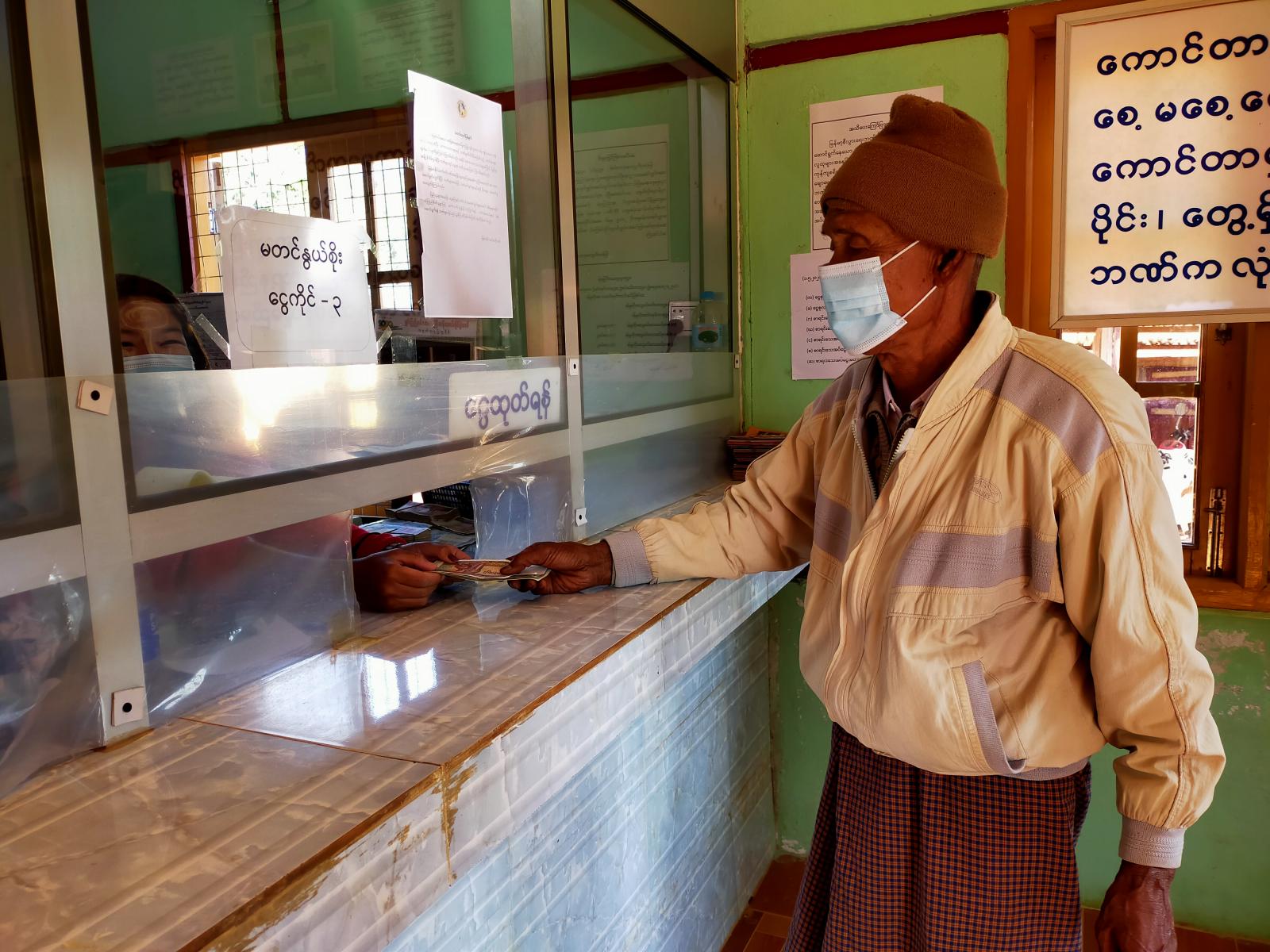 ပင်စင်လစာများထုတ်ပေးရာတွင် မြန်မာ့စီးပွားရေးဘဏ်မှ ဘဏ်မန်နေဂျာ ဦးသိန်းထွန်းရွှေ နှင့်ဝန်ထမ်းများက ကျန်းမာရေးနှင့်အားကစားဝန်ကြီးဌာနမှ ထုတ်ပြန်ထားသော ကိုဗစ်-၁၉ ဆိုင်ရာ စည်းကမ်းသက်မှတ်ချက်များနှင့်အညီ ကိုယ်အပူချိန်တိုင်းတာပေးခြင်း၊ နှာခေါင်းစည်းများ တပ်ဆင်အသုံးပြုရေး၊ လက်သန့်ဆေးရည်များ၊ လက်ဆေးရန် ဘေစဉ်ဆပ်ပြာများ ထားရှိပေးပြီး e Pension Card အသုံးပြုကာ စနစ်တကျ ဘဏ်ဝန်ဆောင်မှုများဖြင့် ထုတ်ပေးလျက်ရှိသည်။