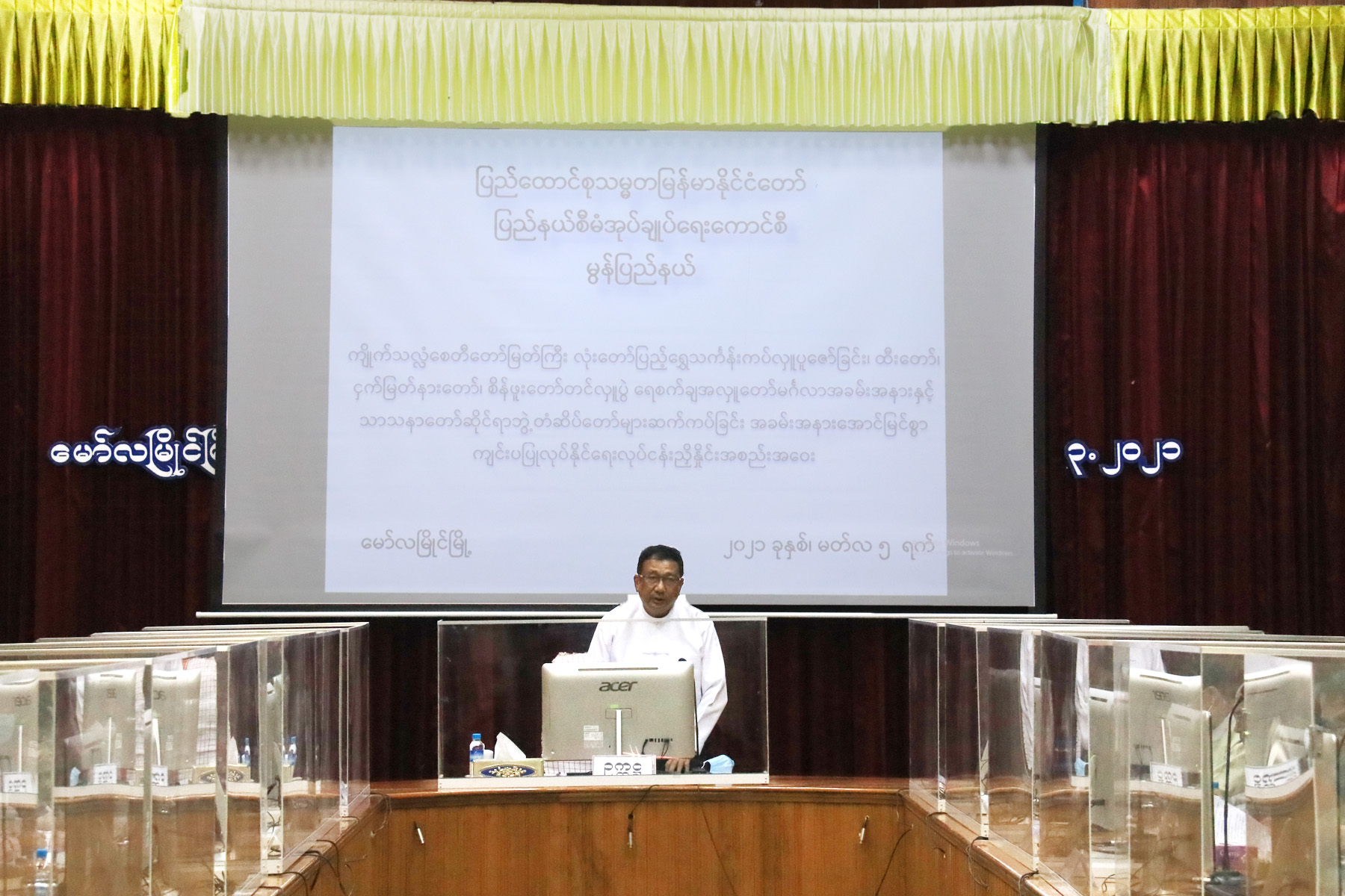 ကျိုက်သလ္လံစေတီတော်မြတ်ကြီး လုံးတော်ပြည့် ရွှေသင်္ကန်းကပ်လှူပူဇော်ခြင်း၊ ထီးတော်၊ ငှက်မြတ်နားတော်နှင့် စိန်ဖူးတော်တင်လှူပွဲ ရေစက်ချအလှူတော် မင်္ဂလာအခမ်းအနားနှင့် သာသနာတော်ဆိုင်ရာ ဘွဲ့တံဆိပ်တော်များ ဆက်ကပ်ခြင်းအခမ်းအနား အောင်မြင်စွာ ကျင်းပပြုလုပ်နိုင်ရေးအတွက် လုပ်ငန်းညှိနှိုင်းအစည်းအဝေးကို ယမန်နေ့နံနက် ၉ နာရီခွဲက မော်လမြိုင်မြို့ မွန်ပြည်နယ်စီမံအုပ်ချုပ်ရေးကောင်စီရုံး အောင်ဆန်းခန်းမတွင် ကျင်းပခဲ့သည်။