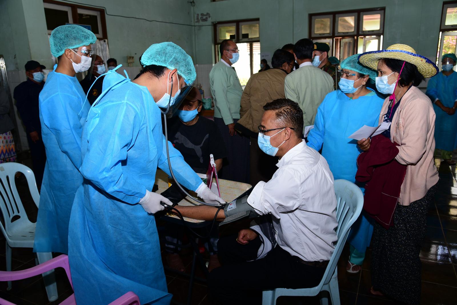 ကိုဗစ်-၁၉ ရောဂါ ကာကွယ်ဆေး ထိုးနှံခြင်းမပြုမီ ကျန်းမာရေးဝန်ထမ်းများမှ ကိုယ်အပူချိန် တိုင်းတာပေးခြင်း၊ သွေးပေါင်ချိန် တိုင်းတာပေးခြင်း၊ အောက်ဆီဂျင်ပမာဏပါဝင်မှု တိုင်းတာပေးခြင်း၊ မူလရောဂါအခံ ရှိ/မရှိ စမ်းသပ်ဆောင်ရွက်ပေးခဲ့ကြောင်း သိရသည်။