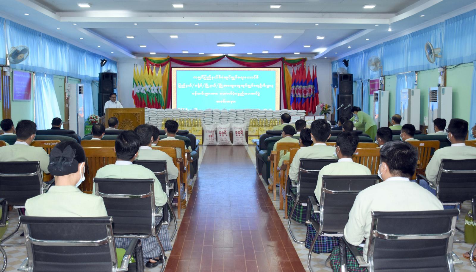 ယင်းနောက် ပြည်နယ်စီမံအုပ်ချုပ်ရေးကောင်စီဥက္ကဋ္ဌက အထွေထွေအုပ်ချုပ်ရေးဦးစီးဌာန၊ ပြည် နယ်ရုံးနှင့် မြစ်ကြီးနားခရိုင်ရုံးဝန်ထမ်းများအတွက်လည်းကောင်း၊ ပြည်နယ်ကောင်စီအဖွဲ့ဝင်များဖြစ်ကြ သည့် ဦးမျိုးဆွေနှင့် ဦးတိန့်ဆောင်တို့က မိုးညှင်းခရိုင်နှင့် ဗန်းမော်ခရိုင်တို့ရှိ ဝန်ထမ်းများအတွက်လည်း ကောင်း၊ ပြည်နယ်ကောင်စီအတွင်းရေးမှူး ဦးခင်မောင်လေးက ပူတာအိုခရိုင်အတွင်းရှိ ဝန်ထမ်းများ အတွက်လည်းကောင်း ငွေကျပ် (၁၀၆၈၂၅၀၀)တန်ဖိုးရှိ ဆန်၊ ဆီနှင့် ကုလားပဲများကို အသီးသီးထောက် ပံ့ပေးအပ်ခဲ့ကြရာ သက်ဆိုင်ရာဝန်ထမ်းများကလက်ခံရယူခဲ့ကြပြီး ထောက်ပံ့ပေးအပ်မှုအတွက် ဝန်ထမ်း တစ်ဦးက ကျေးဇူးတင်စကားပြန်လည်ပြောကြားခဲ့သည်။