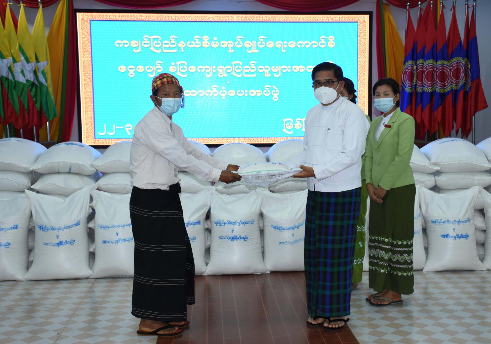 ကချင်ပြည်နယ်စီမံအုပ်ချုပ်ရေးကောင်စီဥက္ကဋ္ဌက မြစ်ကြီးနားမြို့နယ်အတွင်း နေရပ်စွန့်ခွာပြည်သူများ အတွက် ပြန်လည်ထူထောင်ရေးစခန်းတစ်ခုဖြစ်သည့် ငွေပျော်စံပြကျေးရွာနေ အိမ်ထောင်စု (၄၃၁)စုအတွက် ဆန်အိတ်များထောက်ပံ့ပေးအပ်ပွဲကို ယမန်နေ့နံနက် ၁၀ နာရီခွဲတွင် ပြည်နယ်စီမံအုပ်ချုပ်ရေးကောင်စီရုံး ဆမားဒူဝါးဆင်ဝါးနော်ခန်းမ၌ ကျင်းပပြုလုပ်သည်။