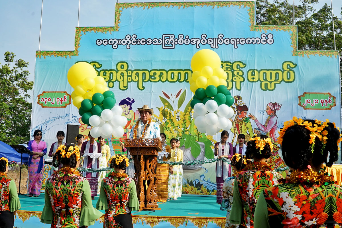 ဆက်လက်ပြီး တိုင်းဒေသကြီးစီမံအုပ်ချုပ်ရေးကောင်စီဥက္ကဋ္ဌက အခမ်းအနားတက်ရောက် လာကြသော ဧည့်ပရိသတ်များအား သပြေခက်ဖြင့် ရေပက်ဖျန်းခြင်း၊ မြန်မာရိုးရာယဉ်ကျေးမှု နှစ်သစ်ကူး အတာသင်္ကြန်ပွဲတော်ကို ယိမ်းအကအလှအဖွဲ့များက နွေဦးကဗျာ၊ ရွှေမန်းမာလာ၊ မန်းတောင်ရိပ်ခို သင်္ကြန်တေးသီချင်းများဖြင့် သီဆို၊ ကပြ ဖျော်ဖြေခြင်းတို့ ဆောင်ရွက်ခဲ့ကြောင်း သိရသည်။