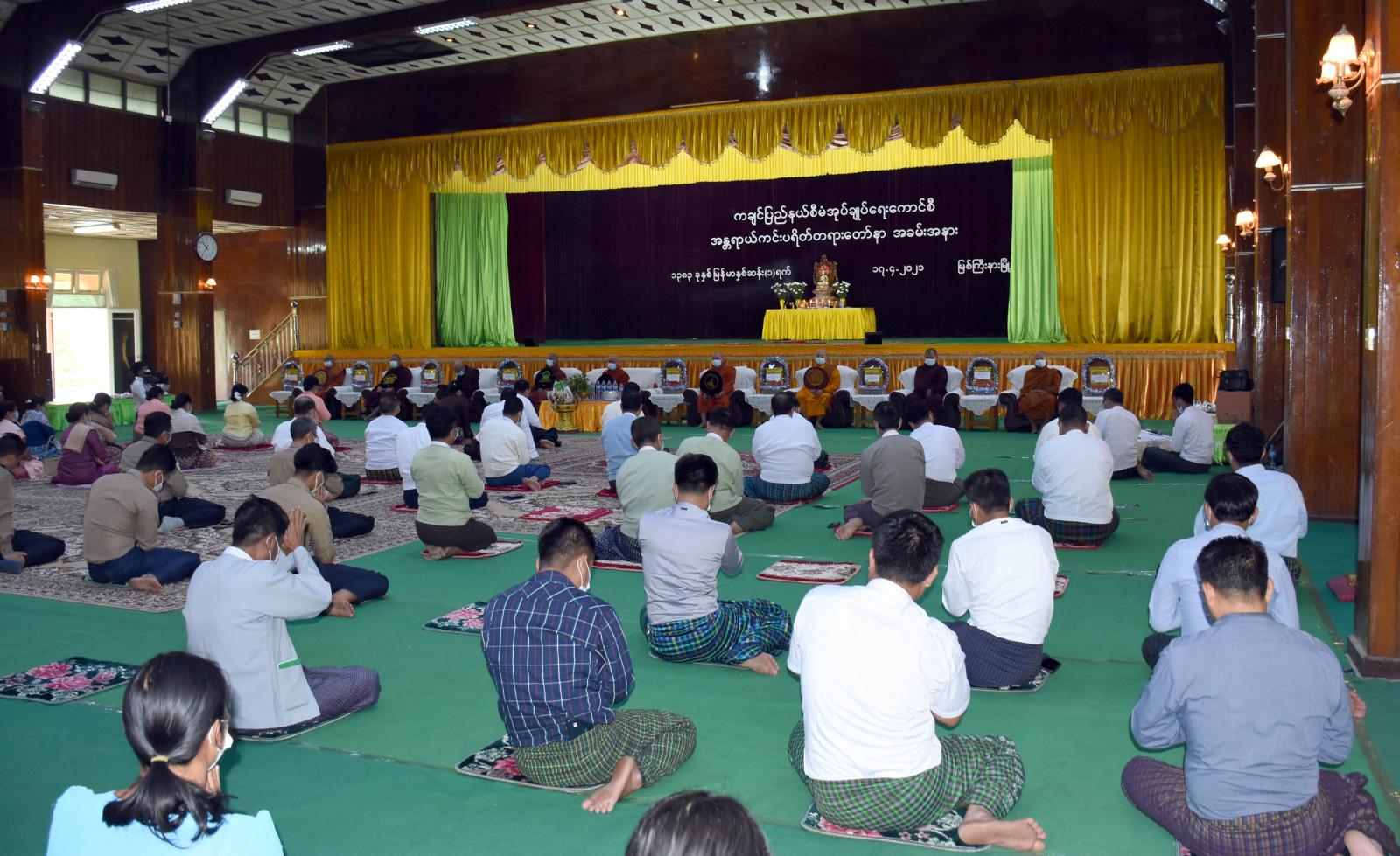 ထို့နောက် မြို့တော်ခန်းမ၌ ပြည်နယ်စီမံအုပ်ချုပ်ရေးကောင်စီမှ ကြီးမှူးကျင်းပသည့် အန္တရာယ်ကင်း ပရိတ်တရားတော်ရွတ်ဖတ်ပူဇော်ပွဲတွင် ဝန်းသိုကျောင်းတိုက်၊ ပြည်နယ်သံဃနာယ ကအကျိုးတော်ဆောင်ဆရာတော်၊ အဂ္ဂမဟာပဏ္ဍိတဘဒ္ဒန္တကေတုမာလာအမှူးပြုသော ဆရာတော်/ သံဃာတော်များက အန္တရာယ်ကင်းပရိတ်တရားတော်များ ရွတ်ဖတ်သရဇ္ဇျယ်တော် မူကြပြီး ပြည်နယ် စီမံအုပ်ချုပ်ရေးကောင်စီဥက္ကဋ္ဌနှင့် အဖွဲ့ဝင်များက ပရိတ်တရားတော်များ နာယူကြကာ သံဃာတော် အရှင်သူမြတ်တို့အား လှူဖွယ်ပစ္စည်းများ ဆက်ကပ် လှူဒါန်းခဲ့ကြပြီး ရေစက်သွန်းချအမျှပေးဝေကြ ကာ သံဃာတော်အရှင်သူမြတ်များအား နေ့ဆွမ်းဆက်ကပ် လှူဒါန်းခဲ့ကြသည်။