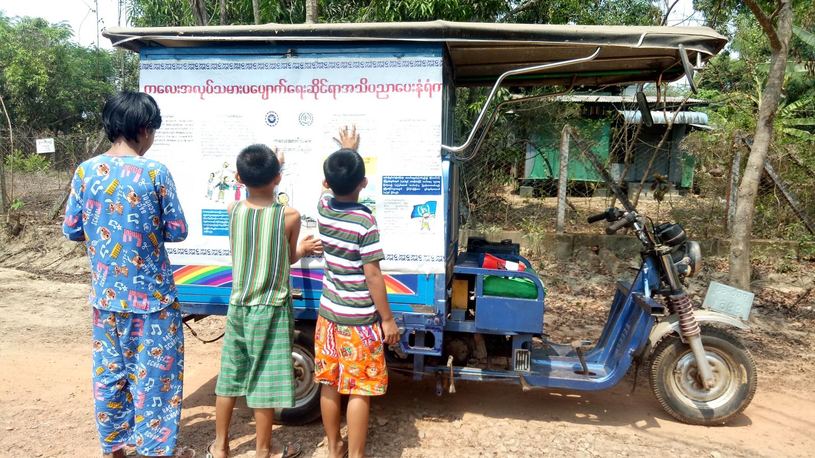 ယင်းကလေးအလုပ်သမားပပျောက်ရေး အသိပညာပေး ကွင်းဆင်းဆောင်ရွက်ရာတွင် မော်တော်ဘိုက် ဖြင့် အသိပညာပေး နံရံကပ်စာစောင်များ ပြသထားရာ ပြည်သူများနှင့်ကလေးသူငယ်များ လာရောက်ကြည့်ရှု ခဲ့ကြောင်း သိရှိရသည်။