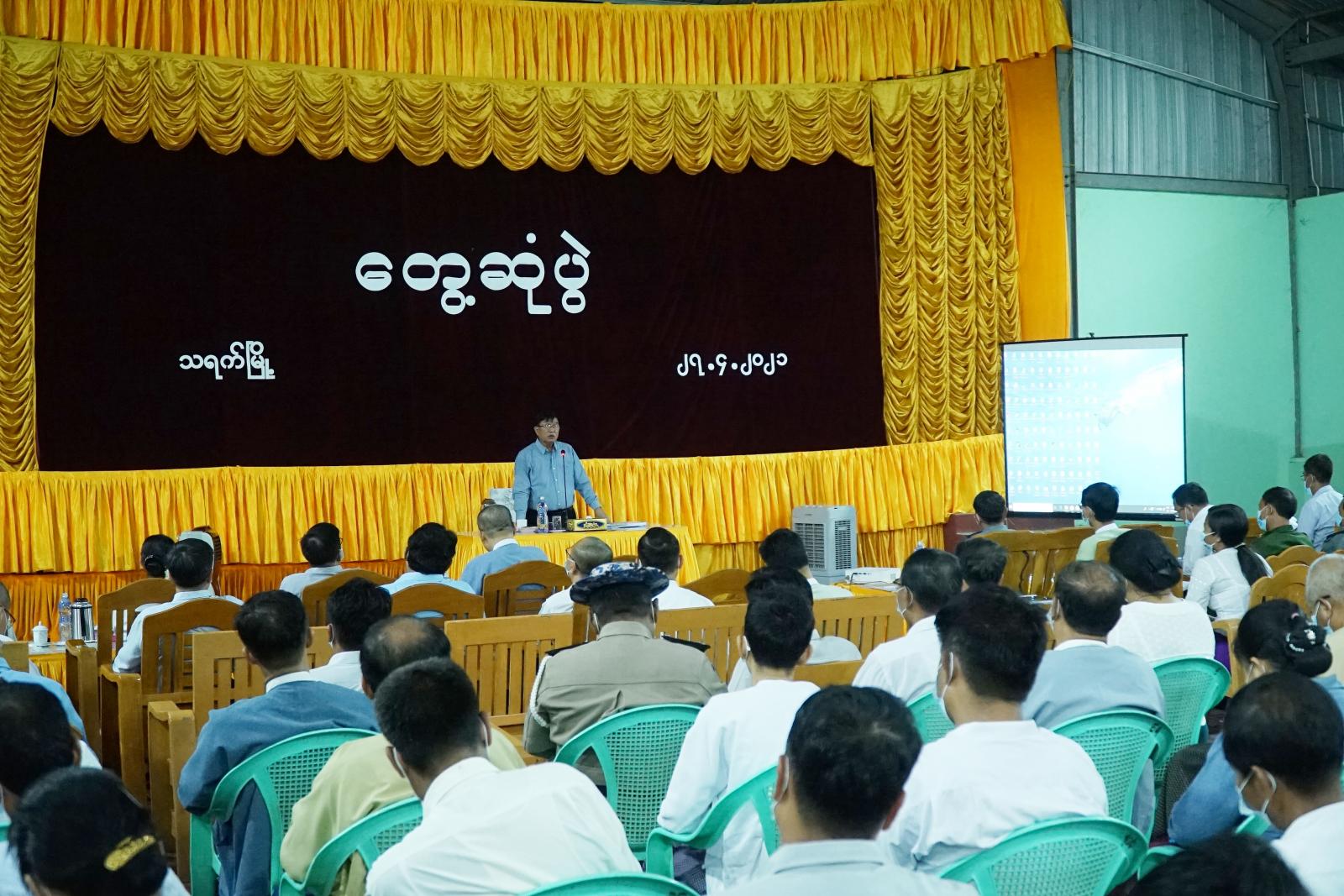 ထို့နောက် မြို့နယ်စီမံအုပ်ချုပ်ရေးဉက္ကဋ္ဌ ဦးမျိုးကျော်ကျော်က သရက်မြို့နယ်၏ဒေသန္တရ အခြေအနေ များကိုတင်ပြပြီး မကွေးတိုင်းဒေသကြီး စီမံအုပ်ချုပ်ရေးကောင်စီဉက္ကဋ္ဌ ဦးတင့်လွင်က နိဂုံးချုပ်အမှာစကားပြောကြားရာတွင် မိမိတို့ တာဝန်ထမ်းဆောင်သည့်ကာလအတွင်း ကျေးရွာ များ၏ ဖွံ့ဖြိုးတိုးတက်ရေး၊ တည်ငြိမ်အေးချမ်းရေးကို အဓိကထား၍ ဆောင်ရွက်လျက်ရှိရာ ရပ်ကွက်၊ ကျေးရွာအုပ်ချုပ်ရေးမှူးများမှ ကူညီဆောင်ရွက်ပေးရန်လိုအပ်ပြီး တပ်မတော်မှ တာဝန်ယူထားသည့် တစ်နှစ်တာကာလအတွင်း ရွေးကောက်ပွဲကျင်းပမည်ဖြစ်၍ မကြာမီ လူဝင်မှုကြီးကြပ်ရေးနှင့်ပြည်သူ့အင်အားဦးစီးဌာနမှ ပန်းခင်းစီမံချက်ဖြင့်မှတ်ပုံတင်စာရင်းများပြုစု တော့မည်ဖြစ်သဖြင့် ရပ်ကွက်၊ ကျေးရွာအုပ်ချုပ်ရေးမှူးများ၊ စာရေးများမှ ပူးပေါင်းဆောင်ရွက် ပေးကြစေလိုကြောင်း၊ ဧည့်စာရင်းဉပဒေပြဌန်းပြီးဖြစ်၍ ဉပဒေနှင့်အညီလိုက် နာကြစေလိုကြောင်း အဖျက်သမားများ၏ သွေးထိုးလှုံဆော်မှုကို မယုံကြည်ကြပဲ မြဝတီနှင့် မြန်မာ့အသံနှင့် ရုပ်မြင်သံကြားတို့မှ ထုတ်လွှင့်သည့်သတင်းများကို ကြည့်ရှုစေလိုကြောင်းပြောကြားပြီး နိုင်ငံ့ ဝန်ထမ်းများအနေဖြင့် နိုင်ငံ့ဝန်ထမ်းဉပဒေ၊ နည်းဉပဒေနှင့် အညီတာဝန် ထမ်းဆောင်ကြစေလို ကြောင်း နိုင်ငံတော်ကိုကာကွယ်ရန် နိုင်ငံသားတိုင်းတွင်တာဝန်ရှိ၍ ရပ်ရွာအေးချမ်းသာယာရေး ကို အားလုံးပူးပေါင်းပါဝင်ဆောင်ရွက်ပေးကြရန် တိုက်တွန်းပြောကြားခဲ့သည်။