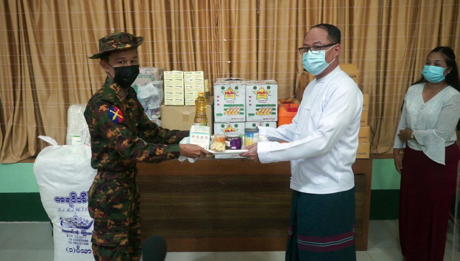 ယင်းနောက် မွန်းလွှဲ ၄ နာရီခန့်အချိန်ခန့်တွင် ကရင်ပြည်နယ်စီမံအုပ်ချုပ်ရေးကောင်စီမှ လုံခြုံရေးတပ်ဖွဲ့ဝင်များအား စားသောက်ကုန်နှင့်ထောက်ပံ့စရိတ်များ ပေးအပ်သည့်အခမ်းအနားကို ကရင်ပြည်နယ် စီမံအုပ်ချုပ်ရေးကောင်စီရုံး အစည်းအဝေးခန်းမ(၂)၌ ဆက်လက်ကျင်းပရာ ပြည်နယ်စီမံအုပ်ချုပ်ရေးကောင်စီ ဥက္ကဋ္ဌ ဦးစောမြင့်ဦးက ရပ်ရွာတည်ငြိမ်ရေး၊ တရားဥပဒေစိုးမိုးရေးနှင့် အများပြည်သူ အေးချမ်းစွာနေနိုင်ရေးအတွက် နေ့မအားညမနား ကျရာတာဝန်ကို ထမ်းဆောင်ပေးခဲ့ကြသည့် တပ်မတော်သားများနှင့် မြန်မာနိုင်ငံရဲတပ်ဖွဲ့ဝင်များကို အထူးကျေးဇူးတင်ရှိပါကြောင်း၊ ယခု ထက်မက ပိုမိုထောက်ပံ့ပေးချင်ပါကြောင်း၊ လိုအပ်သည့် စားသောက်ကုန်များ စရိတ်စကများကို ထောက်ပံပေးသွားမှာဖြစ်ပြီး ဘားအံမြို့နယ်သာမက အခြားမြို့နယ်များတွင် တာဝန်ထမ်းဆောင်နေကြသည့် စစ်သည်များနှင့်ရဲတပ်ဖွဲ့ဝင်များကိုလည်း ဝိုင်းဝန်းကူညီထောက်ပံ့ပေးသွားမည်ဖြစ်ကြောင်း၊ အချိန်ပြည့်တာဝန်ထမ်းပေးကြသည့် မြန်မာနိုင်ငံ ရဲတပ်ဖွဲ့နှင့် တပ်မတော်သားအားလုံးကို ဆက်က်လက် ပံ့ပိုးကူညီပေးနိုင်ရန် ကြိုးပမ်းဆောင်ရွက်သွားမှာဖြစ်ကြောင်း အမှာစကား ပြောကြားသည်။