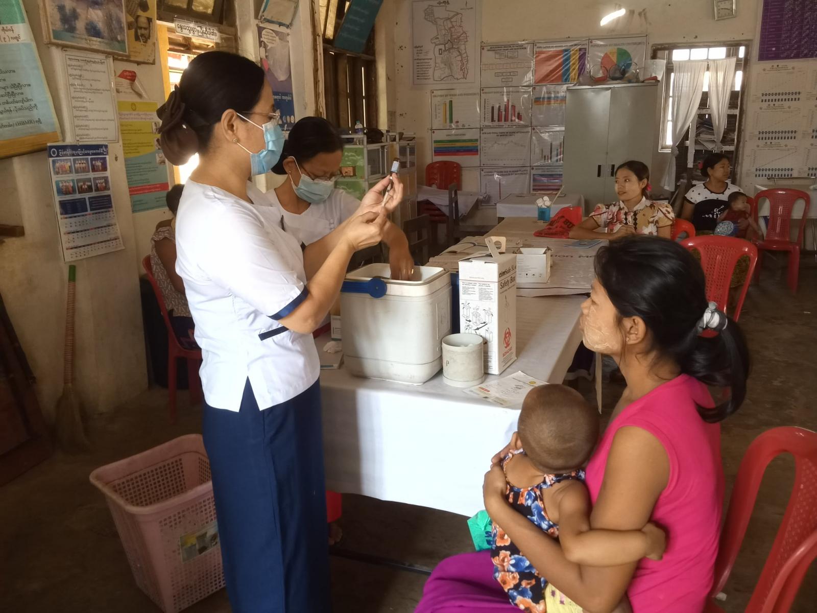 အဆိုပါ မေးခိုင်ကာကွယ်ဆေးထိုးနှံခြင်းနှင့် ပုံမှန်ကာကွယ်ဆေးထိုးနှံ တိုက်ကျွေးခြင်းကို ကိုယ်ဝန်ဆောင်မိခင်များနှင့် ကလေးငယ်များအား ကျန်းမာရေးနှင့်အားကစားဝန်ကြီးဌာန၏ Covid-19 ကြိုတင်ကာကွယ်ရေး ဆိုင်ရာ လမ်းညွန်ချက်များနှင့်အညီထိုးနှံပေးလျှက်ရှိရာ ကိုယ်ဝန် ဆောင်မိခင်လောင်းများအား မေးခိုင်ကာကွယ်ဆေးထိုးနှံ့ပေးခြင်း၊ ကလေး ငယ်များအား အသက် အရွယ်အလိုက် ဘီစီဂျီ၊ ဆုံဆို့၊ ကြက်ညှာ၊ မေးခိုင်နှင့် အသည်းရောင်အသာဝါဘီ၊ ဦးနှောက်အမဲ ရောင်၊ ငါးမျိုးစပ် ကာကွယ်ဆေး၊ ပြင်းထန်အဆုပ်ရောင်(ပီစီဗွီ)၊ ဝက်သက်ဂျိုက်သိုး၊ ပြင်းထန်ဝမ်း ပျက်ဝမ်း လျှော(ရိုတာ)နှင့် ပိုလီယိုကာကွယ်ဆေးစသော ရောဂါကာကွယ်ဆေးများအား ထိုးနှံပေး ခြင်း၊ ကလေးငယ်များအား ကိုယ်အလေးချိန်တိုင်းတာ ပေးခြင်းနှင့်ကျန်းမာရေးစစ်ဆေးပေးခြင်း တို့အား ဆောင်ရွက် ပေးခဲ့ကြောင်း သိရသည်။
