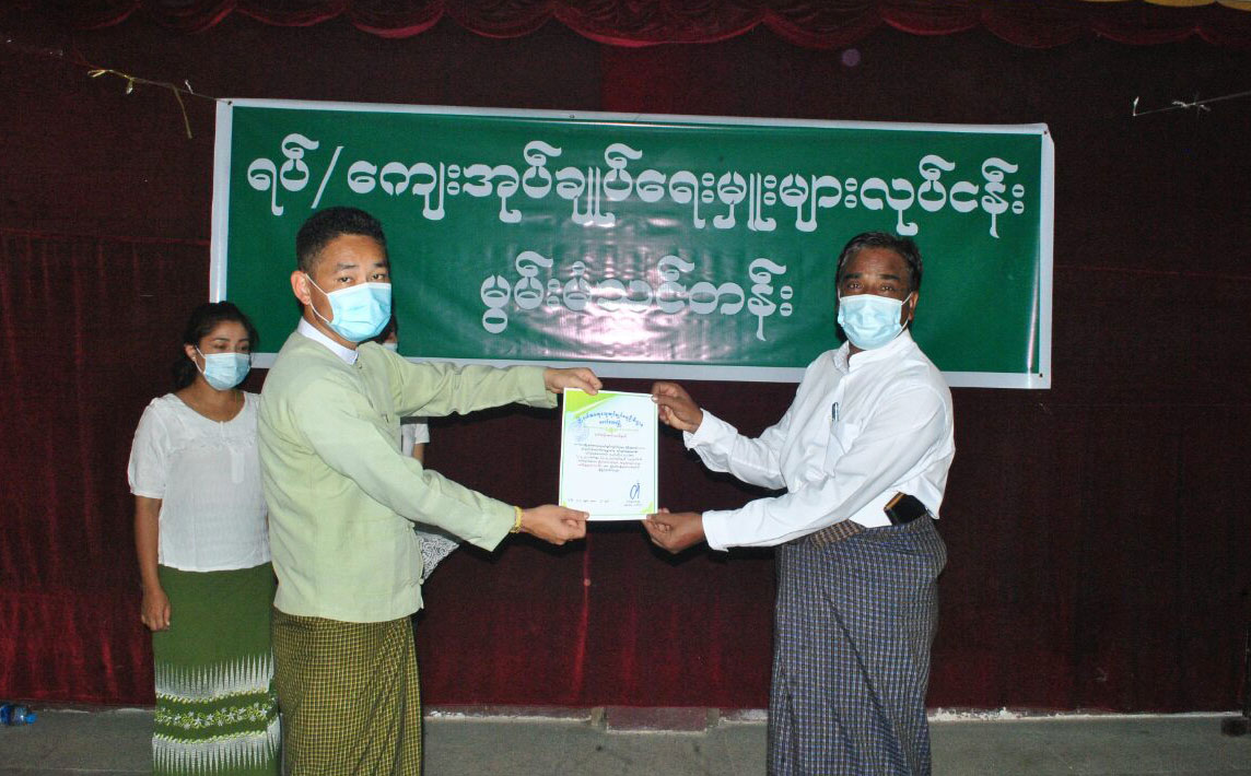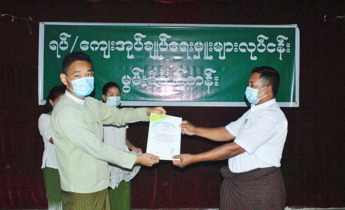 ထို့နောက် မြို့နယ်စီမံအုပ်ချုပ်ရေး အဖွဲ့ ဥက္ကဋ္ဌ ဦးအောင်ရဲက ရပ်ကွက်၊ ကျေးရွာ အုပ်စု အုပ်ချုပ် ရေးမှူး နှင့် ကျေးရွာတာဝန်ခံ (၈၈)ဦးအား သင်တန်းဆင်း လက်မှတ်များ ပေးအပ်ခဲ့ ကြောင်း သိ ရသည်။