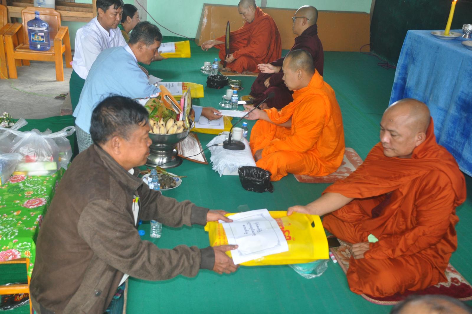ဆက်လက်၍ ဆရာတော်သံဃာတော်များထံမှ ပရိတ်တရားတော်နာယူကြပြီး မြို့နယ်ပညာ ရေးမှူးနှင့် တာဝန်ရှိသူများက ဆရာတော်များထံ ဝါဆိုသင်္ကန်းများ ဆက်ကပ်လှူဒါန်းခဲ့ပြီး လှူဒါန်းမှုအစုစုတို့အတွက် ရေစက်သွန်းချအမျှပေးဝေကာ အခမ်းအနားကို ဗုဒ္ဓသာသနံ စိရံတိဌတု(၃)ကြိမ် ရွတ်ဆိုပြီး ဘုရားကန်တော့ကာ ရုပ်သိမ်းလိုက်ပြီး ဆရာတော် သံဃာတော်များအား နေ့ဆွမ်းဆက်ကပ် လှူဒါန်းခဲ့ကြောင်း သိရှိရသည်။