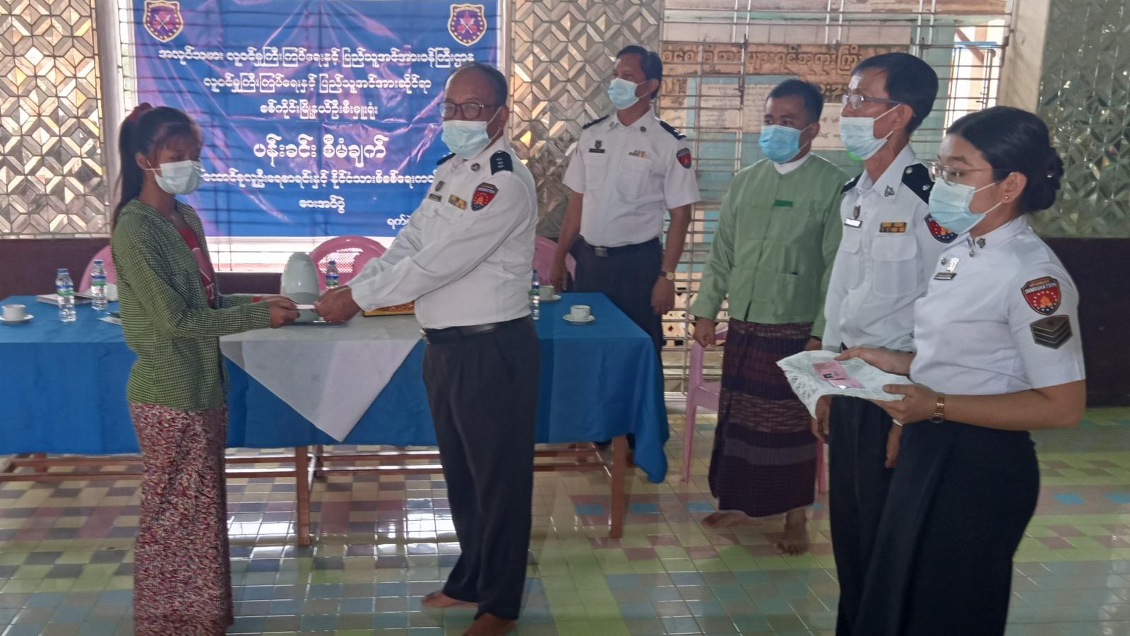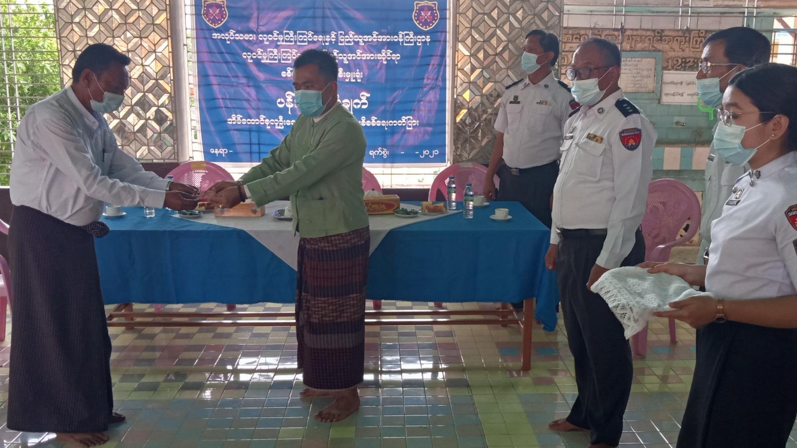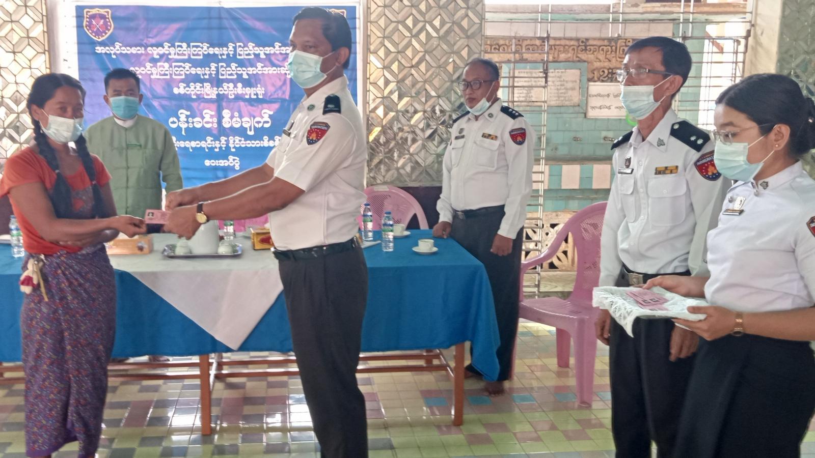 ပန်းခင်းစီမံချက်ဖြင့် နိုင်ငံသားစိစစ်ရေးကတ်များထုတ်ပေးရာတွင် စစ်ကိုင်းမြို့၊ တင်းတိပ်ရပ် ကွက်တွင် (၃၅)ဦး၊ ပန်ဘဲတန်းရပ်ကွက်တွင်(၅၀)ဦး၊ တကောင်းရပ်ကွက်တွင်(၄၅)ဦး၊ စုစုပေါင်း(၁၃၀)ဦး တို့အား လူဝင်မှုကြီးကြပ်ရေးနှင့်ပြည်သူ့အင်အားဆိုင်ရာ ခရိုင်ဦးစီးမှူး ဦးသက်ခိုင်၊ မြို့နယ်စီမံအုပ်ချုပ် ရေးအဖွဲ့ ဥက္ကဋ္ဌ ဦးကျော်စွာမောင်စိုး၊ လူဝင်မှုကြီးကြပ်ရေးနှင့်ပြည်သူ့အင်အားဆိုင်ရာ မြို့နယ် ဦးစီးမှူး ဦးလေးမောင်တို့က လက်ဝယ်အရောက်ပေးအပ်ခဲ့ကြသည်။