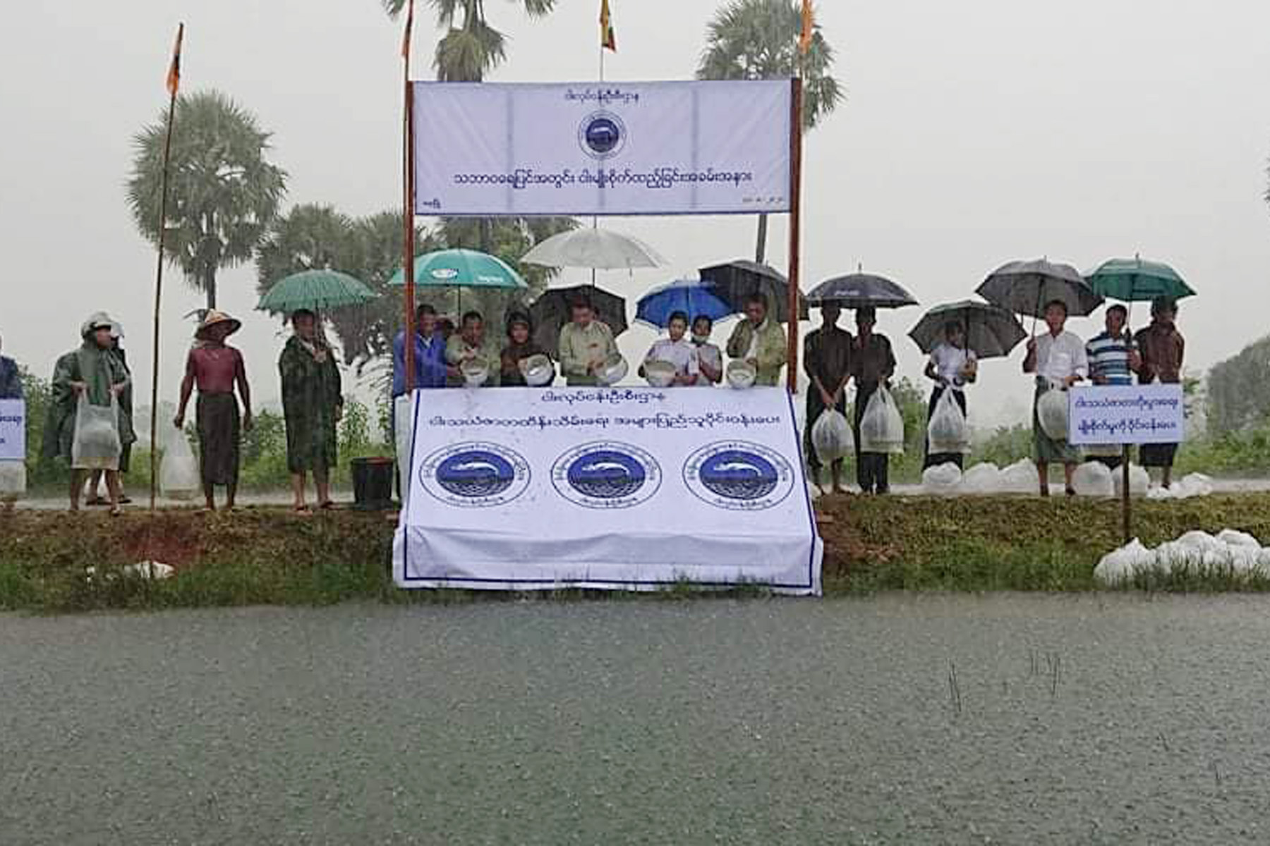 အဆိုပါ အခမ်းအနားသို့ မြို့နယ်အုပ်ချုပ်ရေးမှူး ဦးကံဝင်း၊ မြို့နယ်ငါးလုပ်ငန်းဦးစီးဌာန မှူး ဦးဝင်းကိုကိုဦး၊ မြို့နယ်စိုက်ပျိုးရေးဦးစီးဌာနမှူး ဦးစိုးနိုင်၊ မြို့နယ်မွေးမြူရေးနှင့် ကုသရေး ဦးစီးဌာနမှူးဒေါက်တာသန်းထွဋ်အောင်၊ မြို့နယ်အဆင့်ဌာနဆိုင်ရာများနှင့် တောင်သူများ တက် ရောက်ကြပြီး အစင်ကျေးရွာအုပ်စု ဆိပ်ကလေးကျေးရွာရှိ တောင်သူ(၁၃)ဦးတို့၏ လယ်မြေများ အတွင်းသို့ ငါးခုံးမကြီးနှင့် ရွှေဝါငါးကြင်း၊ ငါးသန်သားပေါက်ကောင်ရေ (၄၀၀၀၀)နှင့် သဘာဝ ရေပြင်အတွင်းသို့ ငါးမြစ်ချင်း ငါးသန်သားပေါက်ကောင်ရေ (၂၀၀၀၀)တို့အား ပထမအကြိမ်စိုက် ထည့်ခဲ့ကြောင်းသိရှိရသည်။