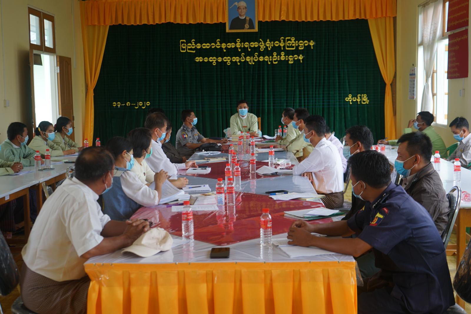 ဆက်လက်၍ ခရိုင်အရေးပေါ်ကာလ စီမံခန့်ခွဲမှု ကော်မတီအတွင်းရေးမှူး ၊ ခရိုင်ရဲတပ်ဖွဲ့မှူးဒုတိယရဲမှူးကြီး စိုးပိုင်က ကော်မတီ၏ လုပ်ငန်းဆောင်ရွက်မှုအခြေအနေ၊ အရေးပေါ်အခြေအနေကြုံတွေ့လာပါက ကြိုတင် ပြင်ဆင်စီမံထားရှိမှုအခြေအနေ၊ ပေါင်းစပ်ဆောင်ရွက်ရမည့်အခြေအနေတို့ကို လည်းကောင်း၊ ခရိုင်ဘေးအန္တရာယ် ဆိုင်ရာ စီမံခန့်ခွဲမှု အဖွဲ့အတွင်းရေးမှူး ဒေါ်ဝင်းမာသိန်း(ဒုတိယဦးစီးမှူး)က ခရိုင်အဆင့် သဘာဝ ဘေးအန္တရာယ် ဆိုင်ရာ စီမံခန့်ခွဲမှုအဖွဲ့တွင် ပါဝင်သည့် အဖွဲ့ငယ်(၁၀)ဖွဲ့၏ လုပ်ငန်းတာဝန်များ၊ သဘာဝဘေး အန္တရာယ် မကျရောက်မီ ၊ ကျရောက်စဉ်နှင့်ကျရောက်ပြီးကာလ ဆောင်ရွက်ရမည့်လုပ်ငန်းစဉ်အသေးစိတ်ကို ရှင်းလင်း တင်ပြခဲ့သည်။