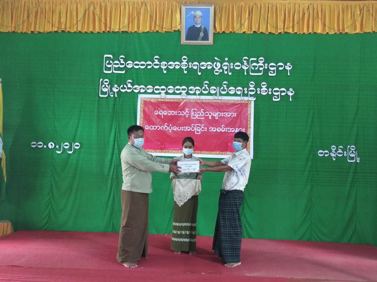 အဆိုပါ ထောက်ပံ့ငွေများ ပေးအပ်ရာတွင် ဇူလိုင်လအတွင်းတွင် မိုးများအဆက် မပြတ်ရွာ သွန်းခြင်းကြောင့် တနိုင်းချောင်းရေးမြင့်တက်လာ၍ နေအိမ်များအတွင်းသို့ ရေများ ဝင်ရောက် လာသဖြင့် ဘေးလွတ်ရာသို့ ပြောင်းရွှေ့နေထိုင်ခဲ့ရသော ဆွတ်ငိုင်ရပ်ကွက်ရှိ ရေဘေးသင့် အိမ်ထောင်စု(၃၃)စု၊ လူဦးရေ(၁၃၁) ဦးတို့အတွက် ဆန်ရိက္ခာ(၇)ရက်စာ လူတစ်ဦး လျှင်(၂၁၀၀)ကျပ်နှုန်းဖြင့် စုစုပေါင်းငွေ (၂၇၅၁၀ဝိ/-) ကျပ်အား ပြည်နယ် ဘေးအန္တရာယ်ဆိုင်ရာ စီမံခန့်ခွဲမှုဦးစီးဌာနမှ ထောက်ပံ့ပေးအပ်သော ထောက်ပံ့ကြေး များအား မြို့နယ်ဘေးအန္တရာယ် ဆိုင်ရာ စီမံခန့်ခွဲမှုအဖွဲ့ ဥက္ကဋ္ဌ (မြို့နယ်အုပ်ချုပ်ရေးမှူး) ဦးကျော်လွင်မှ ပြန်လည်ထောက်ပံ့ပေး အပ်ခဲ့ပြီး ရေဘေးသင့်အိမ်ထောင်စုများကိုယ်စား ဆွတ်ငိုင်ရပ်ကွက် အုပ်ချုပ်ရေးမှူး ဦးဟန်ဂေါင်းမှ လက်ခံရယူခဲ့ကြောင်း သိရသည်။