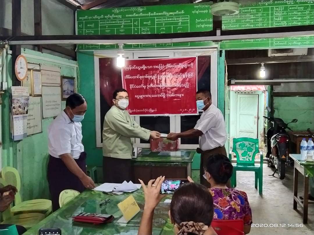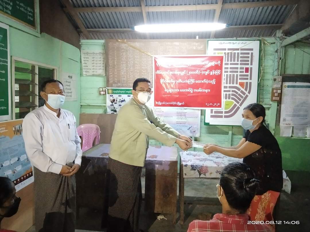 အဆိုပါနိုင်ငံတော်မှထောက်ပံ့ကြေးငွေ ဒုတိယအကြိမ်မြောက်အား ဒုတိယ မြို့နယ် အုပ်ချုပ် ရေးမှူး ဦးမောင်စံဝင်းက ဦးဆောင်၍ မြို့နယ်အတွင်းရှိ အိမ်ထောင်စု( ၅၁၄၂၆) အတွက် ငွေကျပ် သိန်းတစ်သောင်းနှစ်ရာ ရှစ်ဆယ့် ငါးသိန်း နှစ်သောင်းအား ရပ်ကွက်နေ ပြည်သူများ ထံ သွားရောက်ပေးအပ်ခဲ့ကြောင်းသိရသည်။