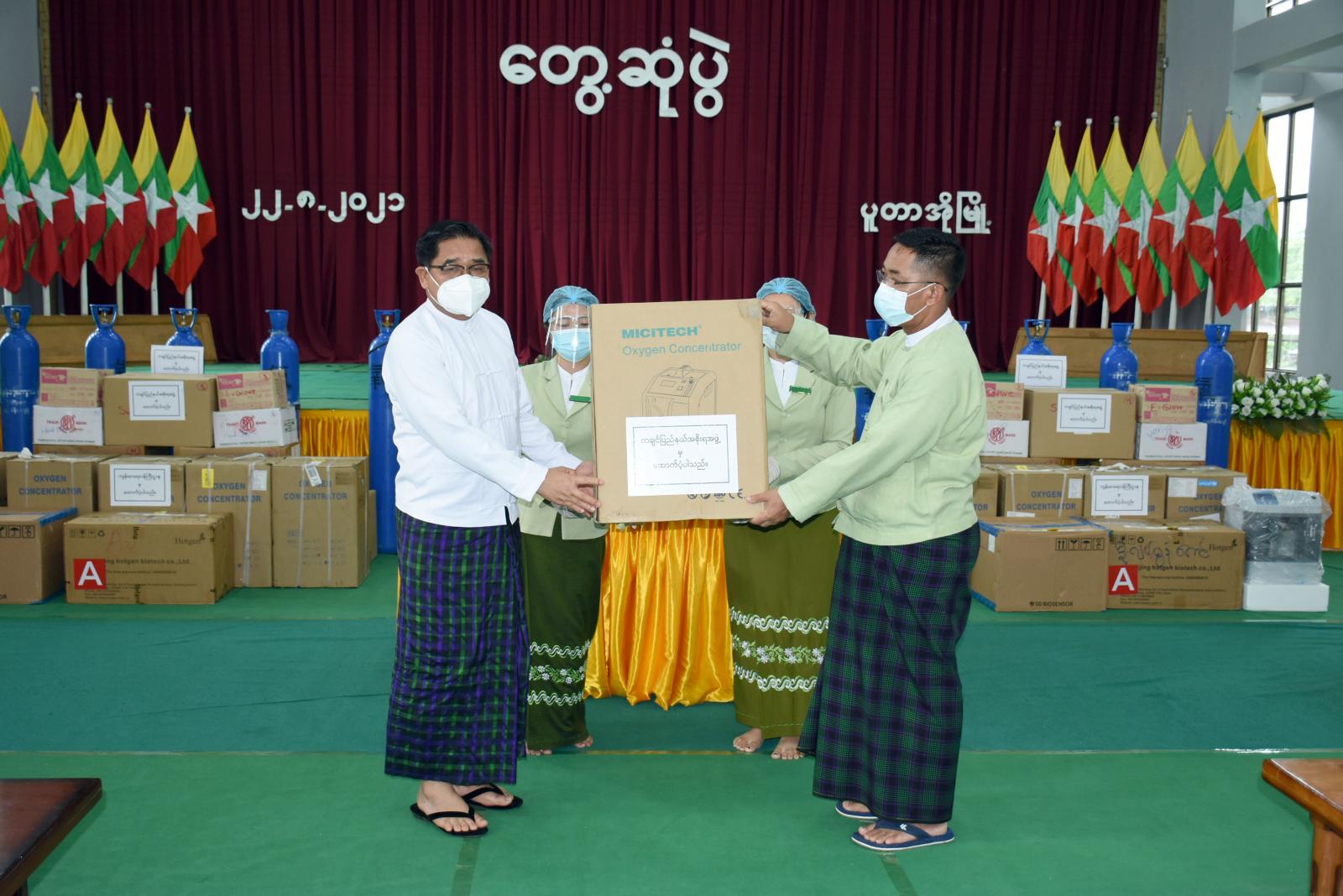 ထို့နောက် ပြည်နယ်ဝန်ကြီးချုပ်နှင့် ပြည်နယ်ဝန်ကြီးများက ခရိုင်၊ မြို့နယ်ဌာန ဆိုင်ရာများအတွက် ငွေကျပ် ၂၆ သိန်း၊ ကိုဗစ်-၁၉ ကာကွယ်ကုသရေးသုံးပစ္စည်းများဖြစ်သည့် Oxygen Concentrator ၁၇ လုံး၊ နှာခေါင်းစည်း Mask (2)မျိုးအတွက် ၃၁၈၀၀ ခု၊ မျက်နှာကာ (Face Shield) ၂၀၀ ခု၊ PPE ဝတ်စုံ ၂၀၀၀ ၊ လက်အိတ်အစုံ ၃၆၀၀ ၊ Hand Gel ဗူး ၃၀၀ ၊ လီတာ ၄၀ ဆံ့ အောက်ဆီဂျင်အိုး ၁၀ လုံး၊ ကိုဗစ်-၁၉အတည်ပြုလူနာများအတွက် ဆန်အိတ်၃၀ အိတ်နှင့် ပူတာအို မြို့ပေါ် ပန်းလှိုင်၊ ပူတောင်းအုပ်စု၊ မန်စေအုပ်စု၊ မာမူးလဲအုပ်စုနှင့် မူလာရှီးဒီရပ်ကွက်တို့အတွက် စံနမူနာပြအဖြစ် အိမ်ခြံဝင်းဟင်းသီးဟင်းရွက် စိုက်ခင်းဖြစ်ထွန်း အောင်မြင်စေရေး ဟင်းသီးဟင်း ရွက်မျိုးစေ့များနှင့် ငွေကျပ် ၁ သိန်းစီဖြင့် စုစုပေါင်းငွေကျပ် ၅ သိန်းနှင့် တိုင်းရင်းရိုးရာယဉ်ကျေးမှု အဖွဲ့ (၄)ဖွဲ့၊ ဘာသာရေးအဖွဲ့အစည်း (၁၄)ဖွဲ့နှင့် လူမှုရေး အသင်းအဖွဲ့ (၄)ဖွဲ့တို့အတွက် ငွေကျပ် ၂ သိန်းစီဖြင့် စုစုပေါင်းငွေကျပ် ၄၄ သိန်းတို့ ထောက်ပံ့ ပေးအပ်ခဲ့ကြပြီး ပြည်နယ်ဝန်ကြီးချုပ်က တင်ပြ ဆွေးနွေးချက်များအပေါ် ညှိနှိုင်းဆောင်ရွက် ပေးခဲ့သည်။