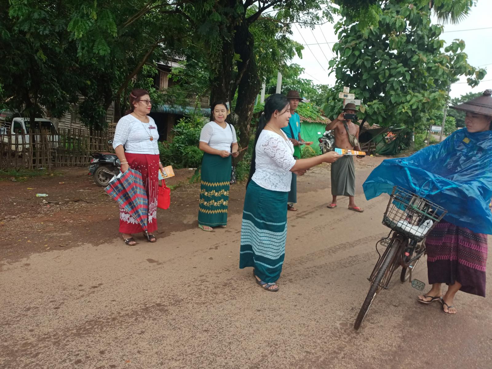 အဆိုပါလက်ကမ်းစာစောင်နှင့် ပိုစတာများကို ရပ်ကွက်/ကျေးရွာများရှိ လူစည်ကားရာနေရာများတွင် ကပ်ပေးခြင်း မြို့နယ်စည်ပင် သာယာ စျေး၊ ဗိုလ်ချုပ်ကြေးရုပ်ရှေ့နှင့် ဆိပ်ကြီးတာဆုံလမ်းများတွင် လက်ကမ်းစာစောင်များ ဖြန့်ဝေပေးခဲ့ကြောင်း သိရ သည်။