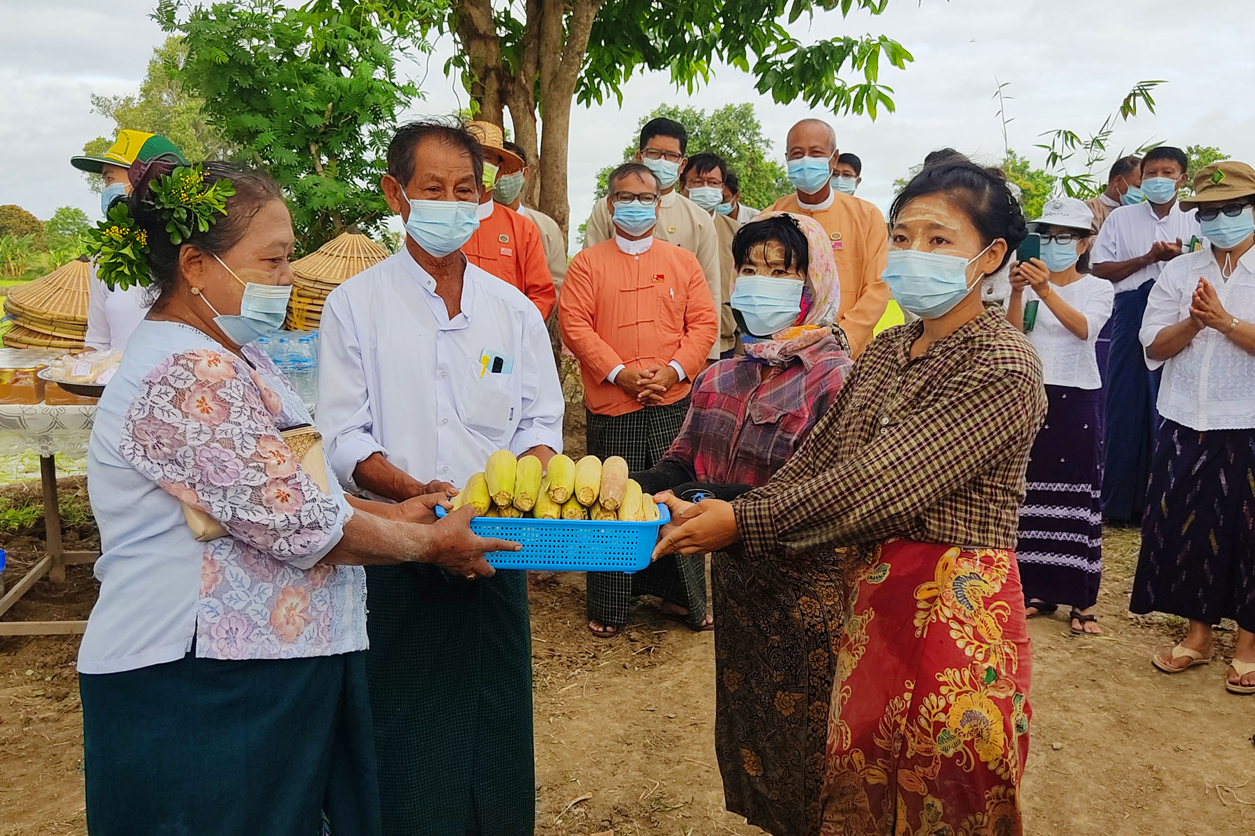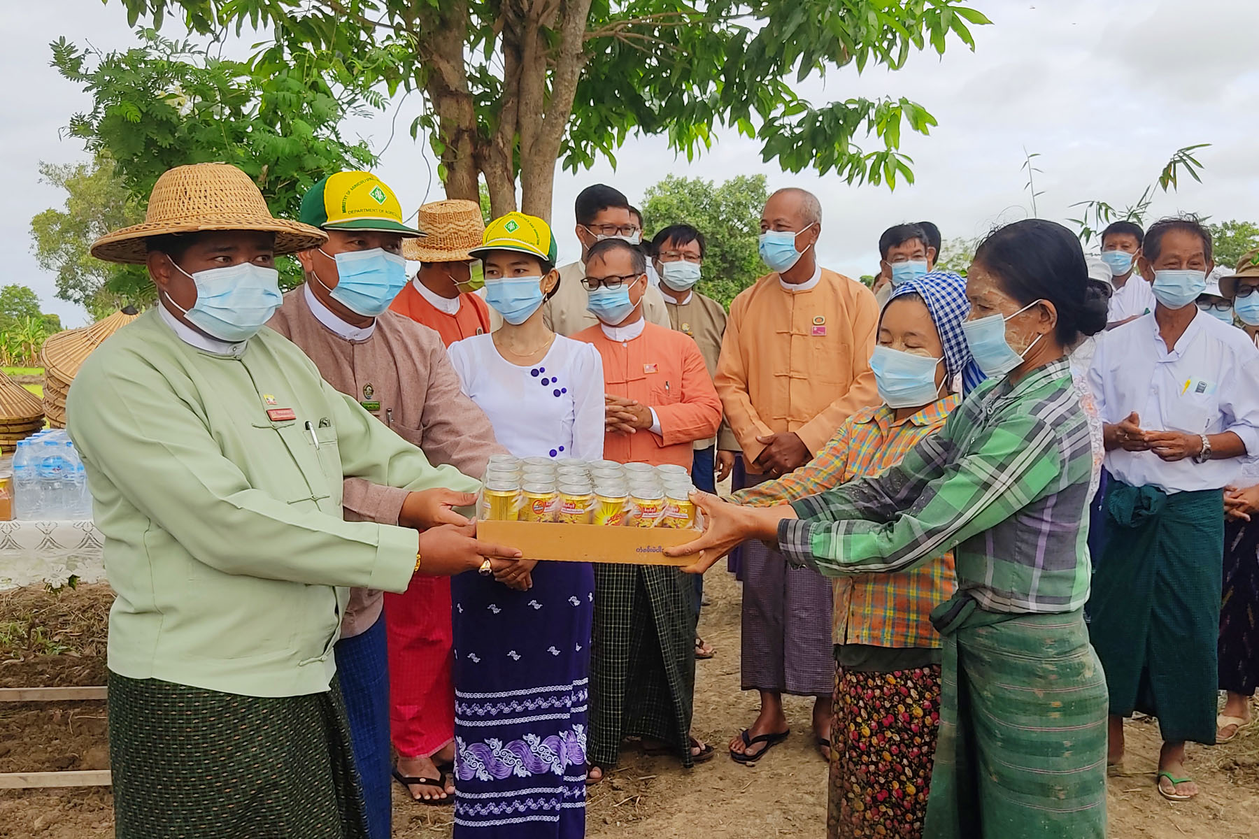 ဆက်လက်၍ မကွေးတိုင်းဒေသကြီးအစိုးရအဖွဲ့ စိုက်ပျိုးရေး၊မွေးမြူရေးနှင့် ဆည်မြောင်း ဝန်ကြီး ဦးဝင်းမော်ဌေးနှင့် တာဝန်ရှိသူများက ကောက်စိုက်လုံမေများအတွက် ခမောက် ဦးထုပ်များ၊ သနပ်ခါးခဲများ၊ မုန့်လုံးရေပေါ်များ၊ မုန့်လိပ်ပြာ၊ ထန်းသီးမုန့် အချိုရည် ဗူးများ နှင့် ရေသန့်ဗူး များကို လက်ဆောင်ပေးအပ်ခဲ့ပြီးနောက် ကောက်စိုက် လုံမေများ ခြောက်တန်း တစ်တန်းလှပ် စနစ်ဖြင့် စိုက်ပျိုးနေမှုများနှင့် တစ်ဧက ကောက်ကွက်ပြည့်မီရေးတို့ကို လိုက်လံကြည့်ရှုစစ်ဆေးခဲ့ပြီး လိုအပ်သည်များကို လမ်းညွှန်မှာကြား ခဲ့ကြောင်း သိရသည်။