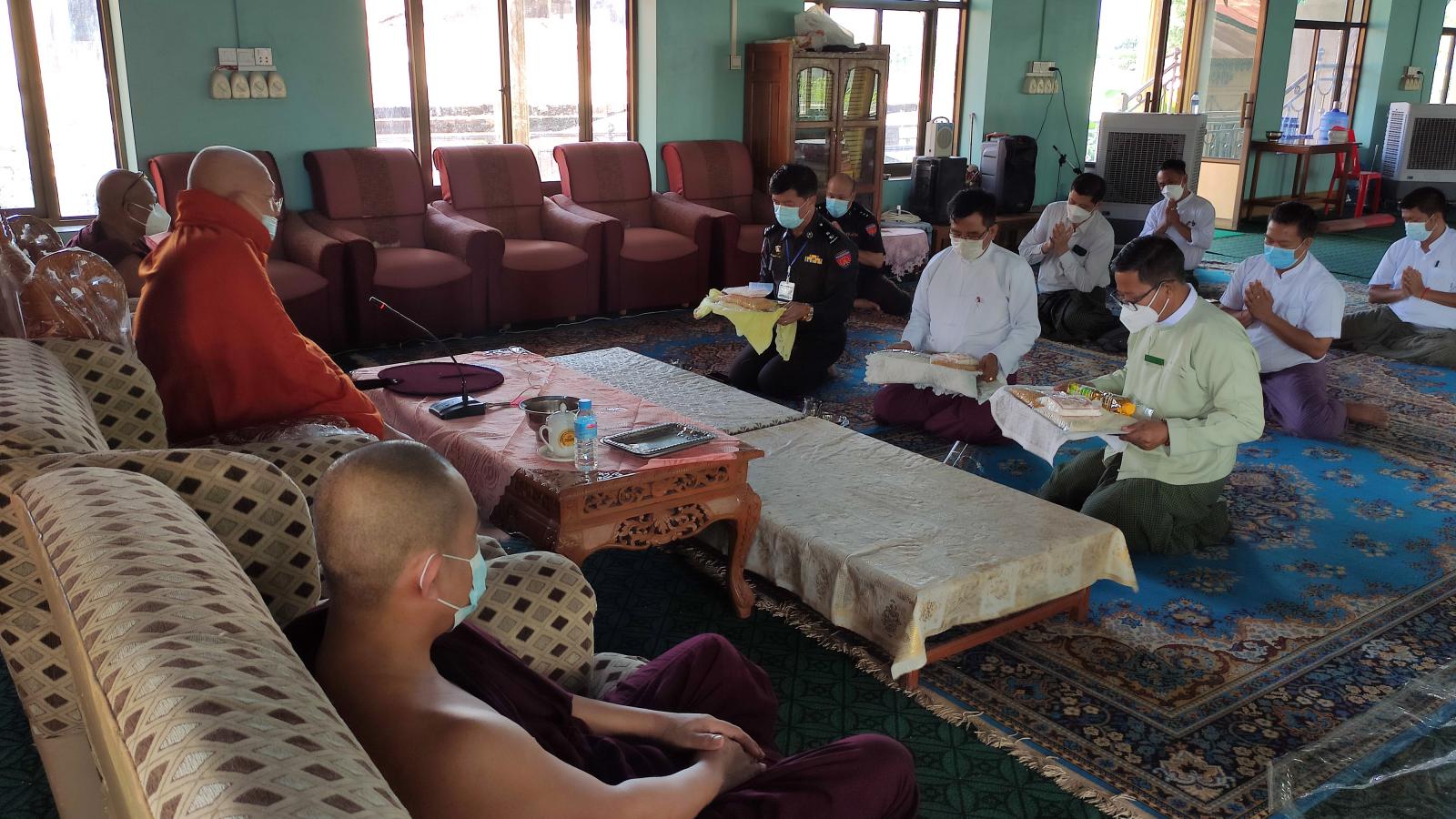 ခရိုင်စီမံအုပ်ချုပ်ရေးအဖွဲ့ ဥက္ကဋ္ဌဦးအေးလူ နှင့်အဖွဲ့ဝင်များက ဗောဓိရပ်သာကျောင်းတိုက်နှင့် တိုက်ကျောင်းပါဠိတက္ကသိုလ်ကျောင်းတိုက်တို့တွင် ဝါဆိုဝါကပ်သီတင်းသုံးတော်မူကြကုန်သော ရဟန်း၊ သာမဏေနှင့် သီလရှင်များအား တိုင်းဒေသကြီးအစိုးရအဖွဲ့ ဆက်ကပ်လှူဒါန်းသော ဆွမ်းဆန်၊ ဆီ၊ ကုလားပဲနှင့် ဆားတို့ကို ဗောဓိရိပ်သာကျောင်းတိုက် ဆရာတော်ကြီးနှင့် တိုက်ကျောင်းပါဠိတက္ကသိုလ်ကျောင်းတိုက် မဟနဆရာတော်တို့ထံ ဆက်ကပ်လှူဒါန်းခဲ့သည်။